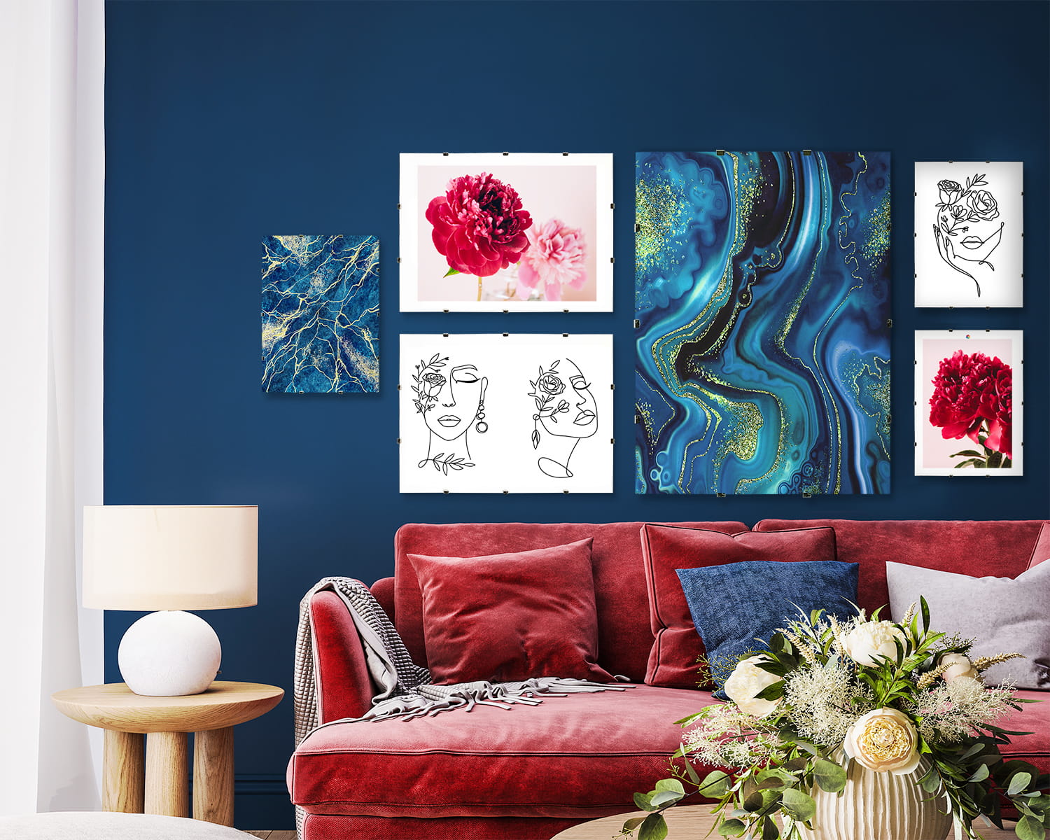 Závěsy se montují do antirámů od rozměru 30x40. Menší rozměry se montují na kovový klip. Tímto způsobem nejsou materiály příliš zatěžovány a antirámek vydrží déle. Antirámy do velikosti 30x40 lze zavěsit na klipy jak horizontálně, tak vertikálně.