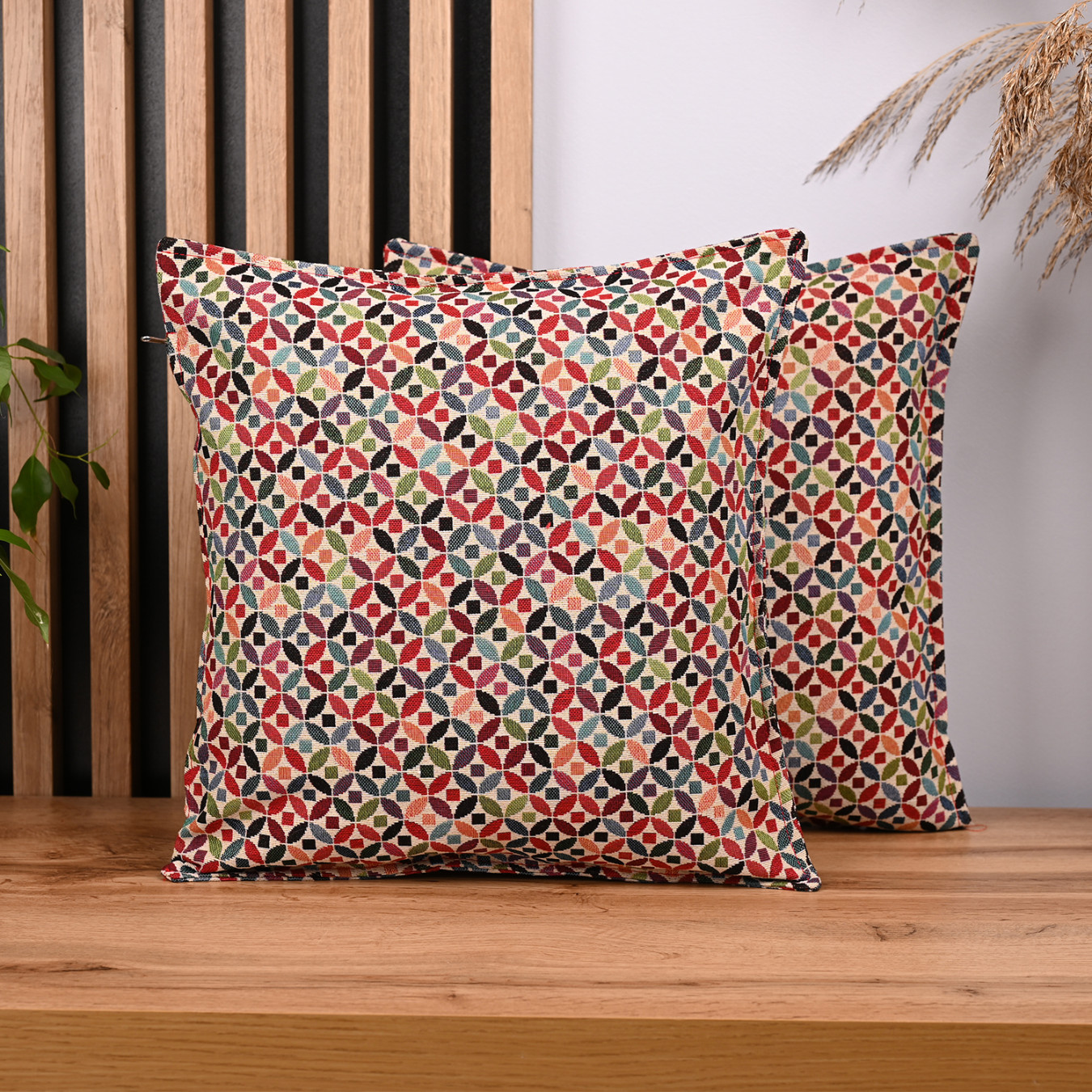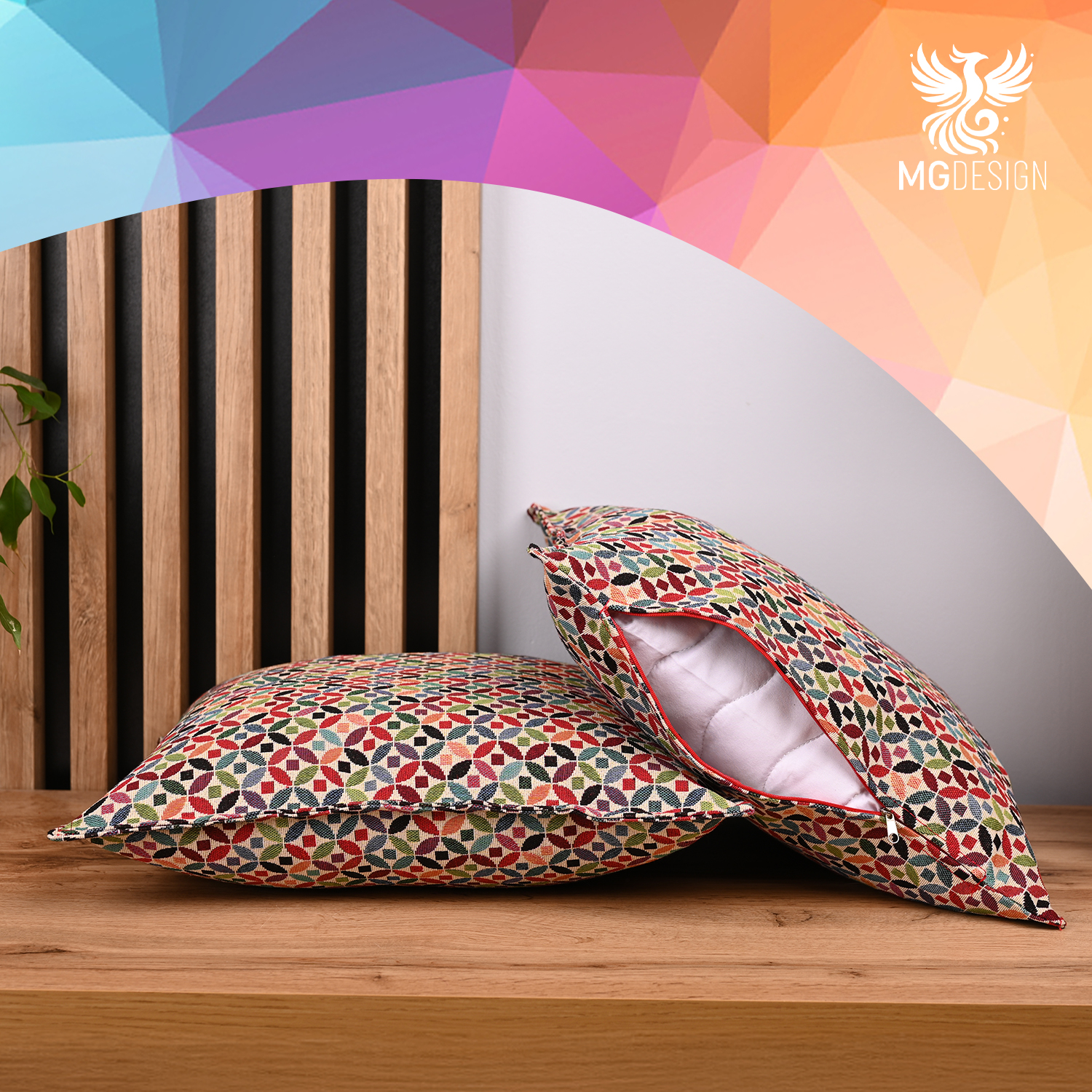 Dekorativní povlak s barevným vzorem je návrh, který oživí interiér a dodá mu individuální charakter. Bohatá barevnost a rozmanitý vzor přitahují pozornost a jsou silným prvkem aranžmá.