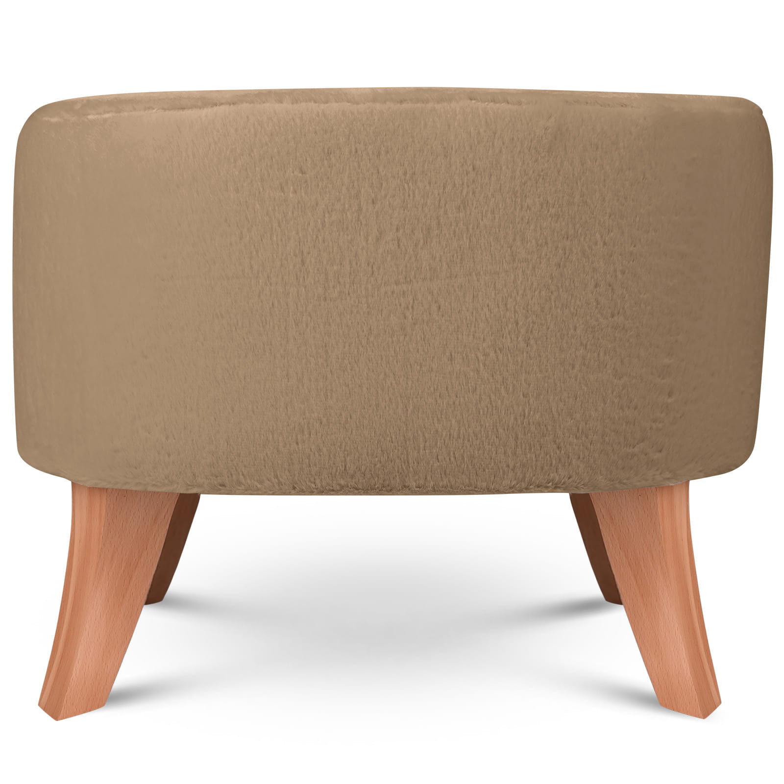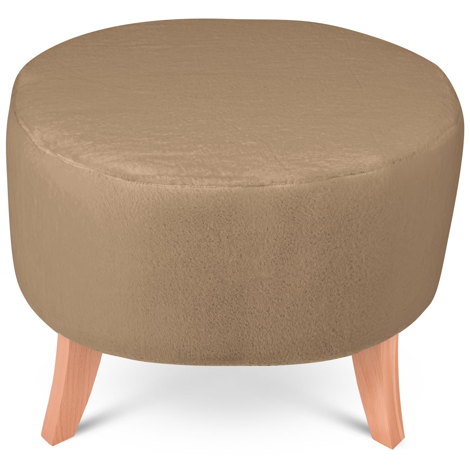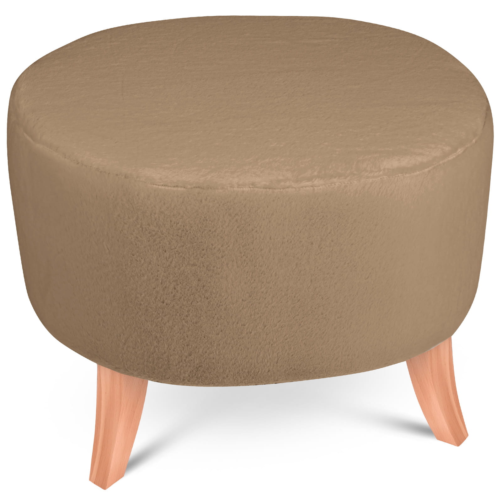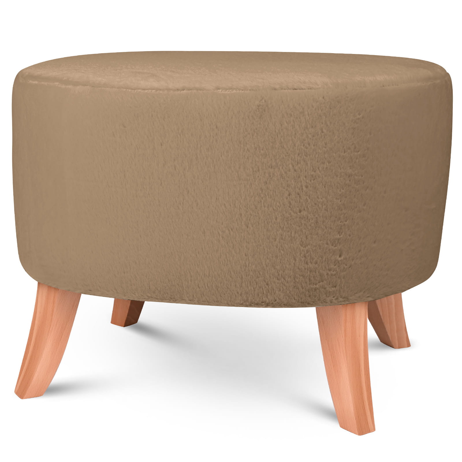 Elegantní oválný puf v imitaci kožešiny s dřevěnými nohami ve světle hnědé barvě o rozměrech 62 x 52 x 46 cm.