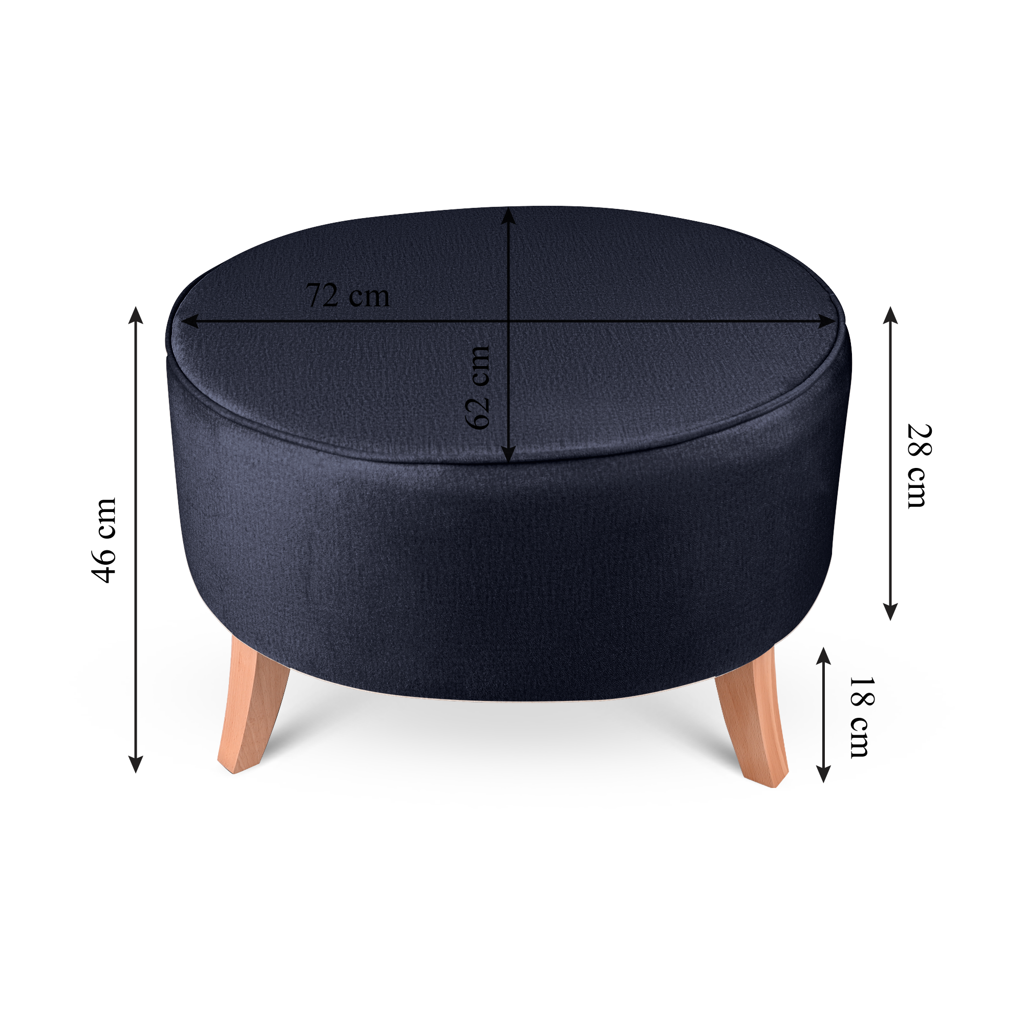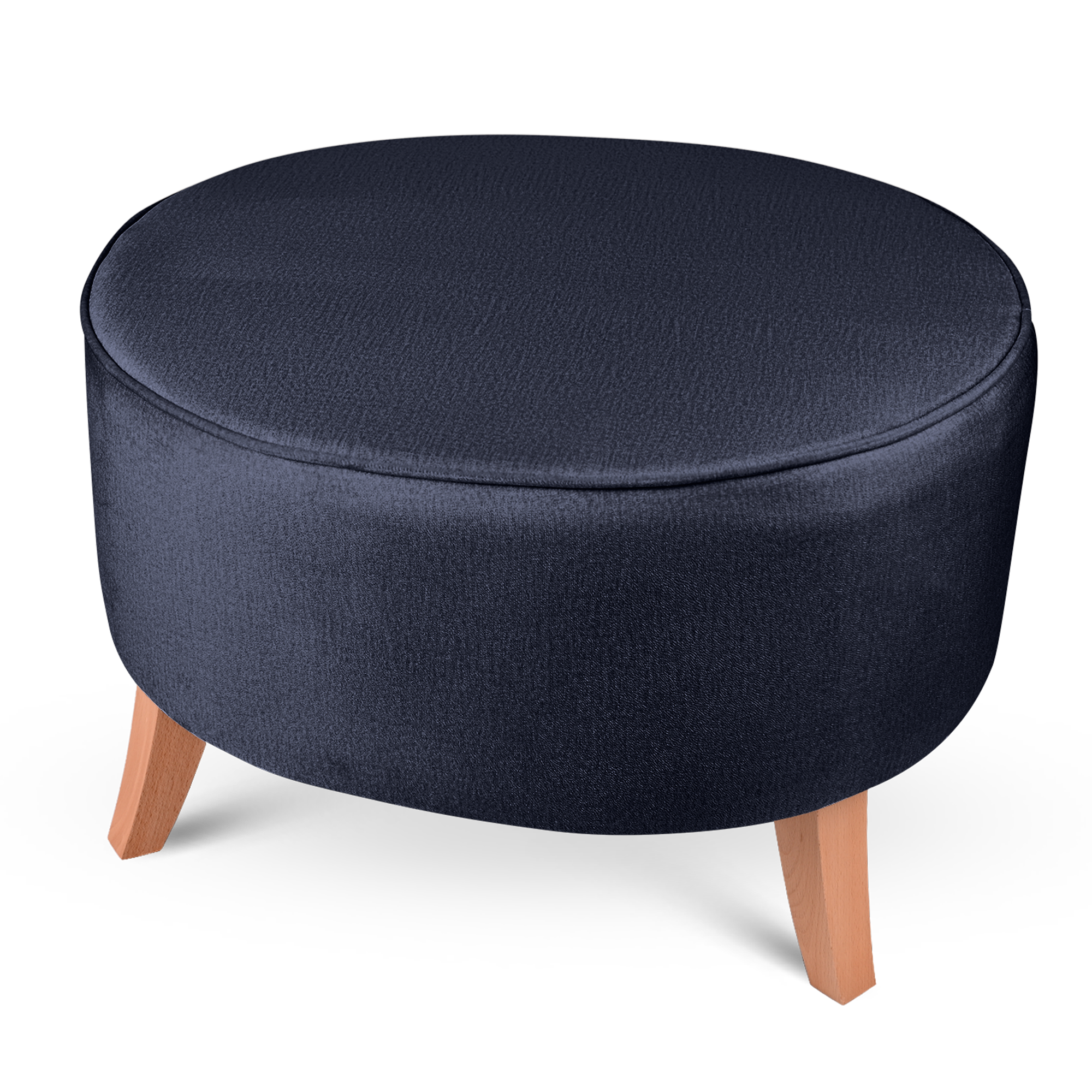 Elegantní oválný velurový puf s dřevěnými nohami v tmavě modré barvě o rozměrech 72 x 62 x 45 cm