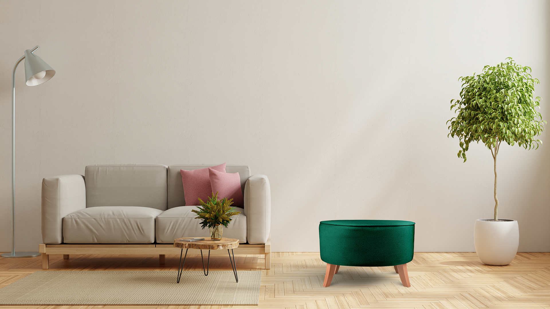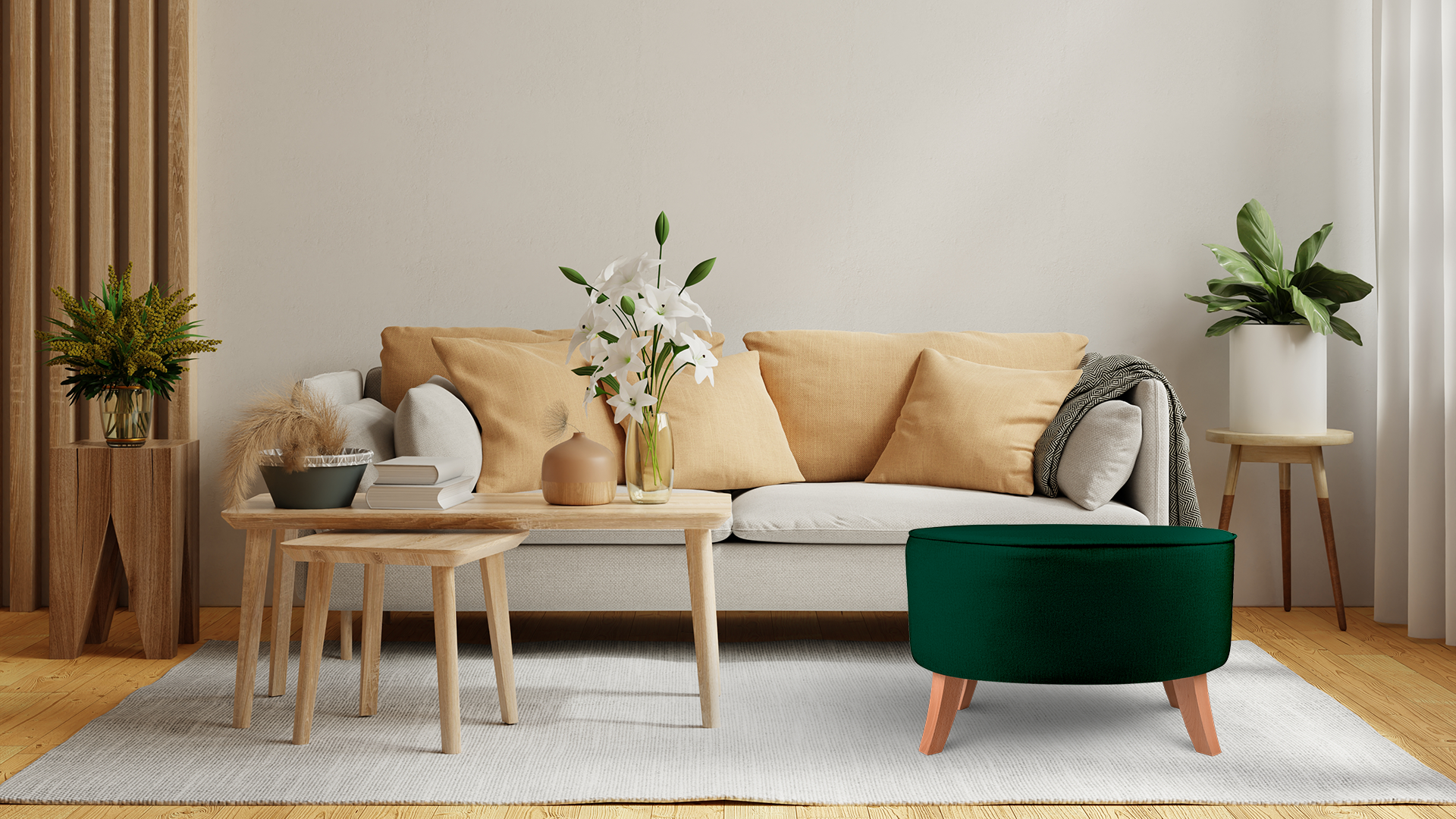 - Puf je vybaven dřevěnými nohami v barvě přírodního dřeva.