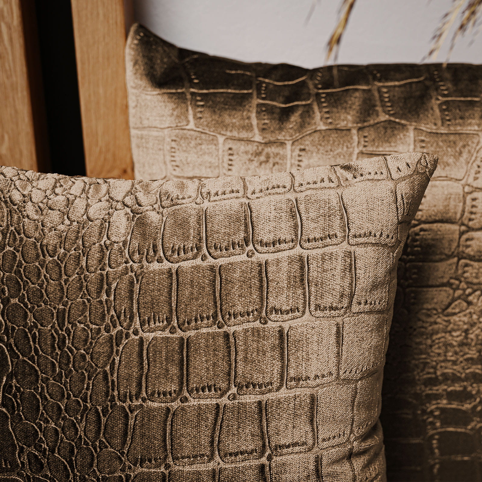 Dekorační povlak na polštář 30x30 cm skořicové barvy z velurové tkaniny s reliéfním vzorem „krokodýlí kůže“