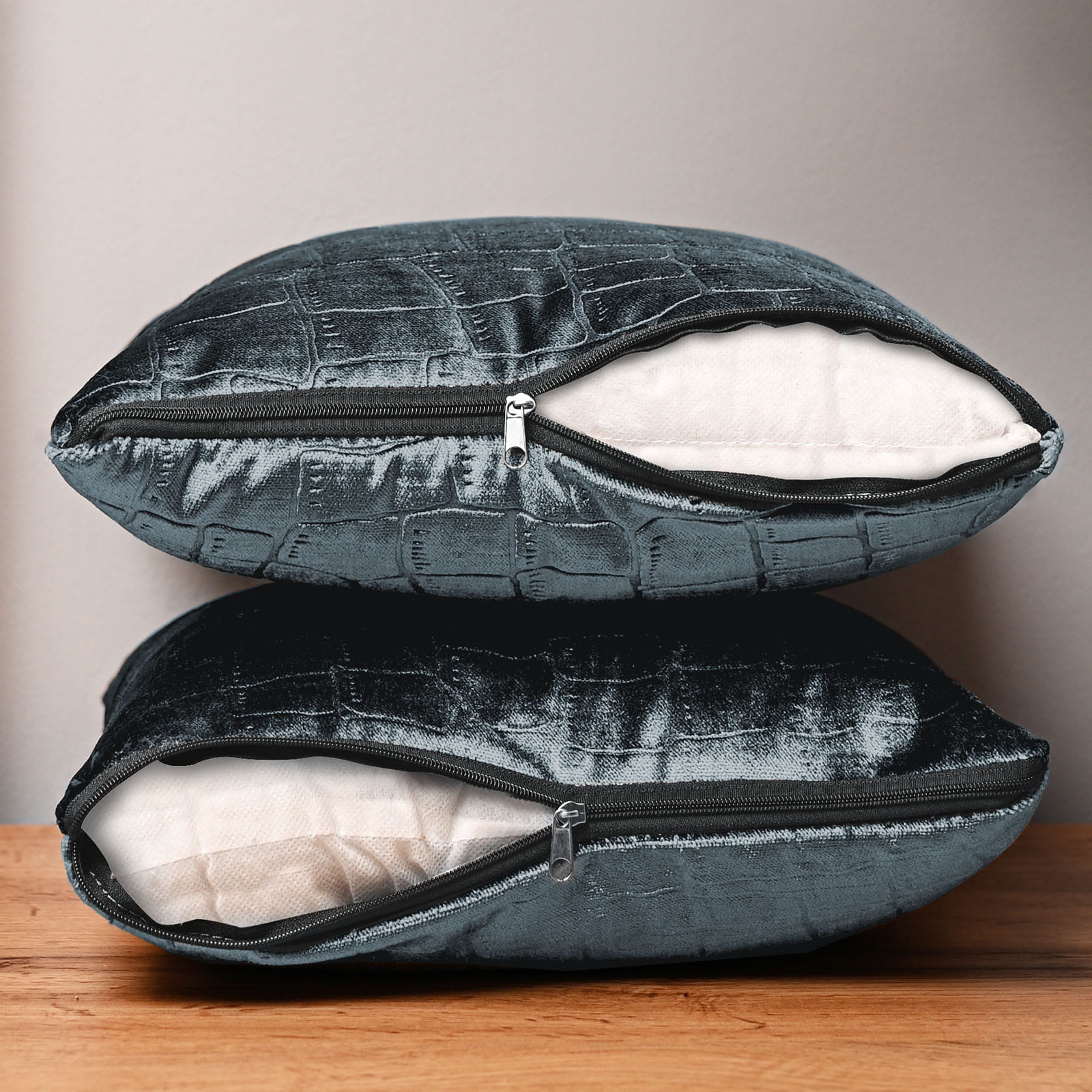 Dekorační povlak na polštář 30x30 cm z šedomodré velurové tkaniny s reliéfním vzorem „krokodýlí kůže“