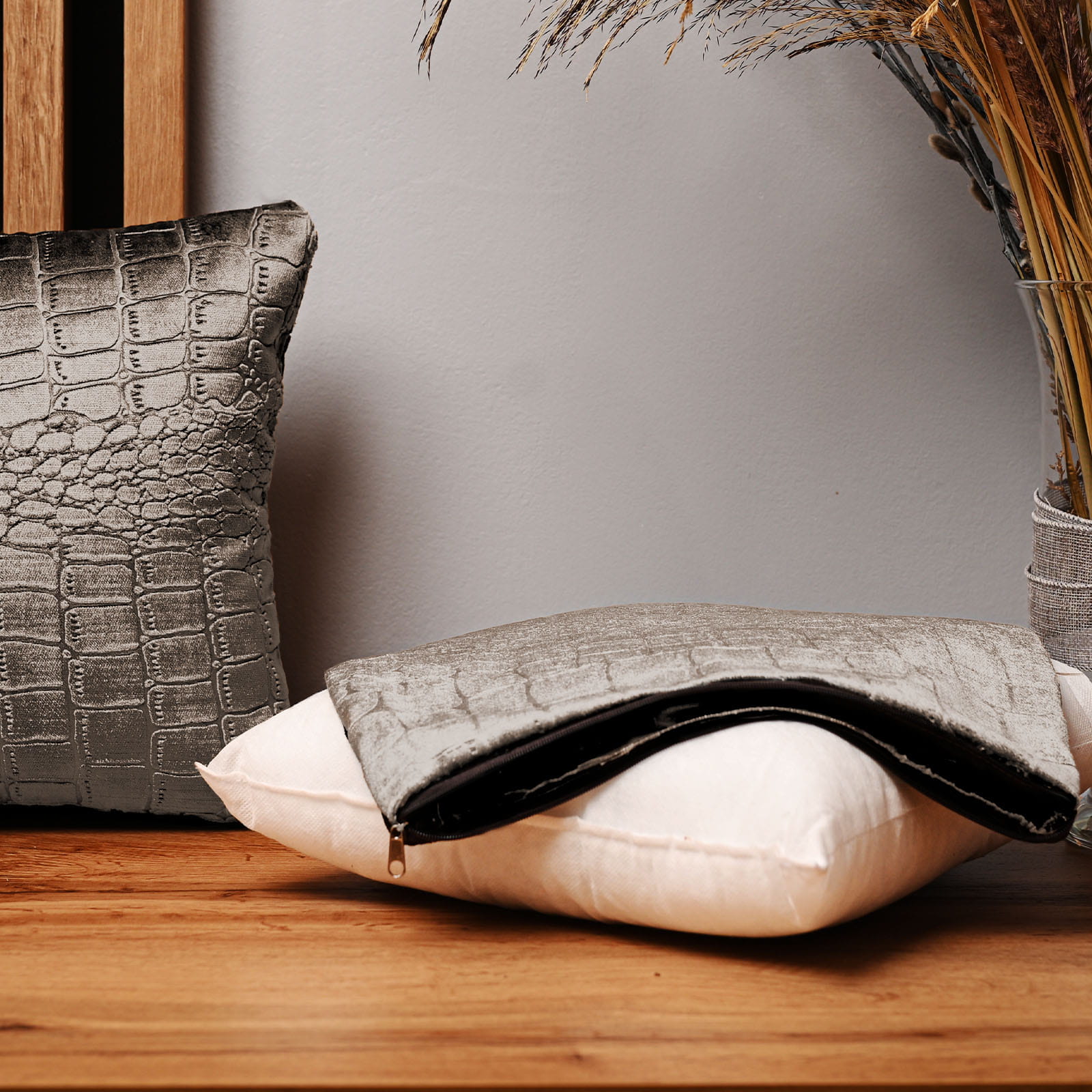 Dekorační povlak na polštář 30x30 cm z velurové tkaniny ocelové barvy s reliéfním vzorem „krokodýlí kůže“