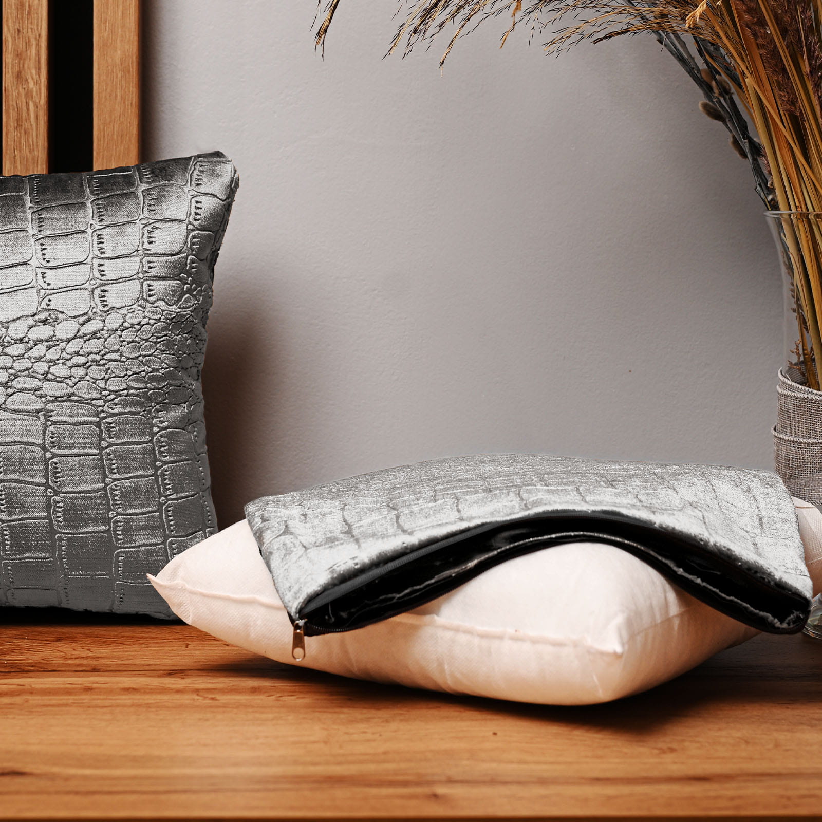 Dekorační povlak na polštář 30x30 cm ze světle šedé velurové tkaniny s reliéfním vzorem „krokodýlí kůže“