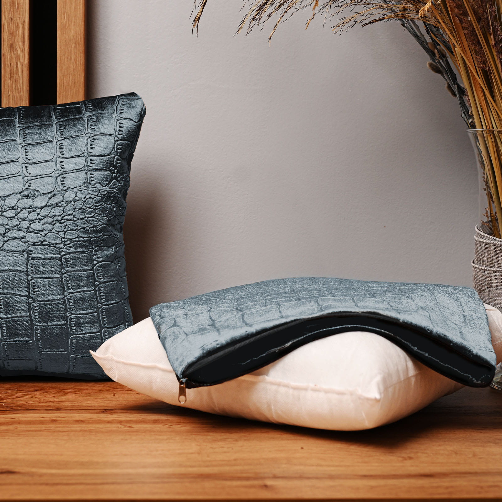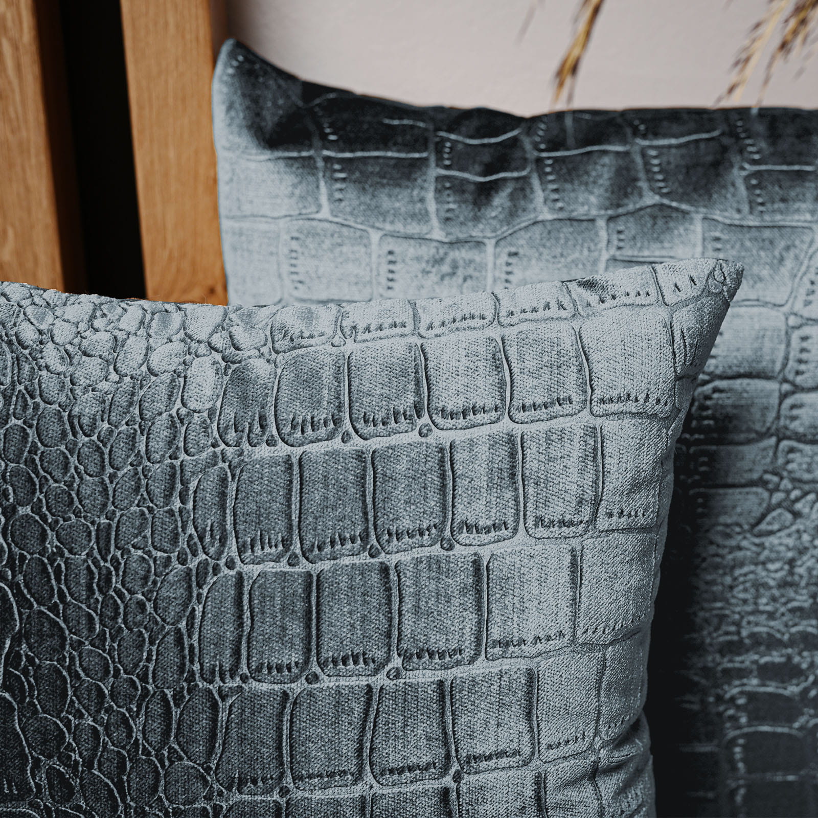 Dekorační povlak na polštář 35x35 cm z šedomodré velurové tkaniny s reliéfním vzorem „krokodýlí kůže“