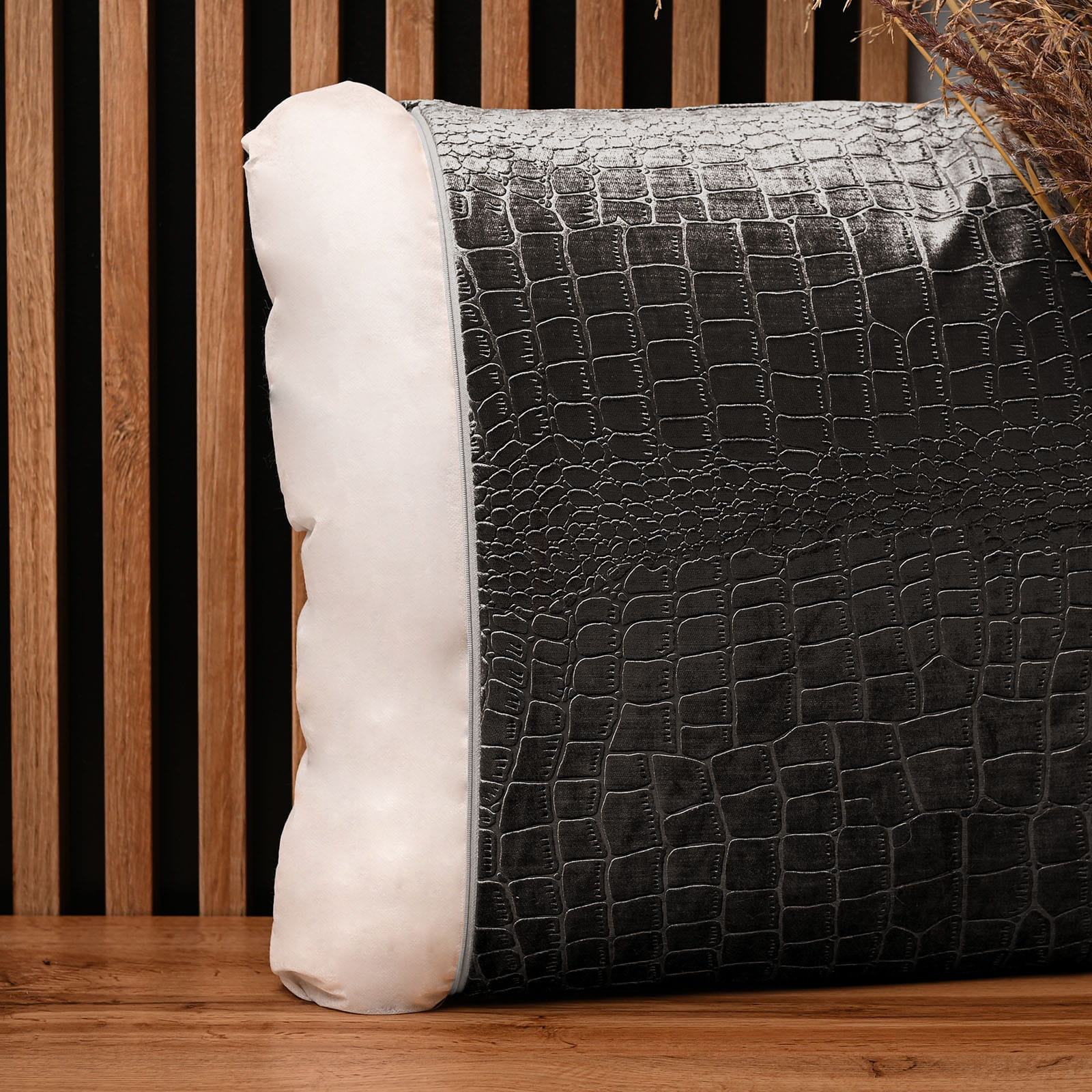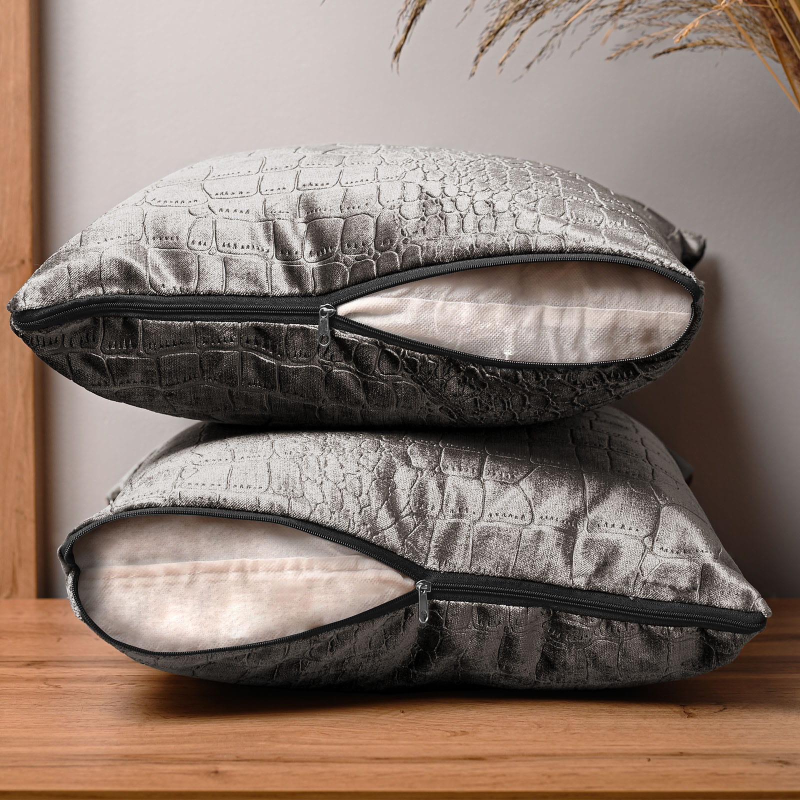 Dekorační povlak na polštář 60x60 cm z šedé velurové tkaniny s reliéfním vzorem "krokodýlí kůže"