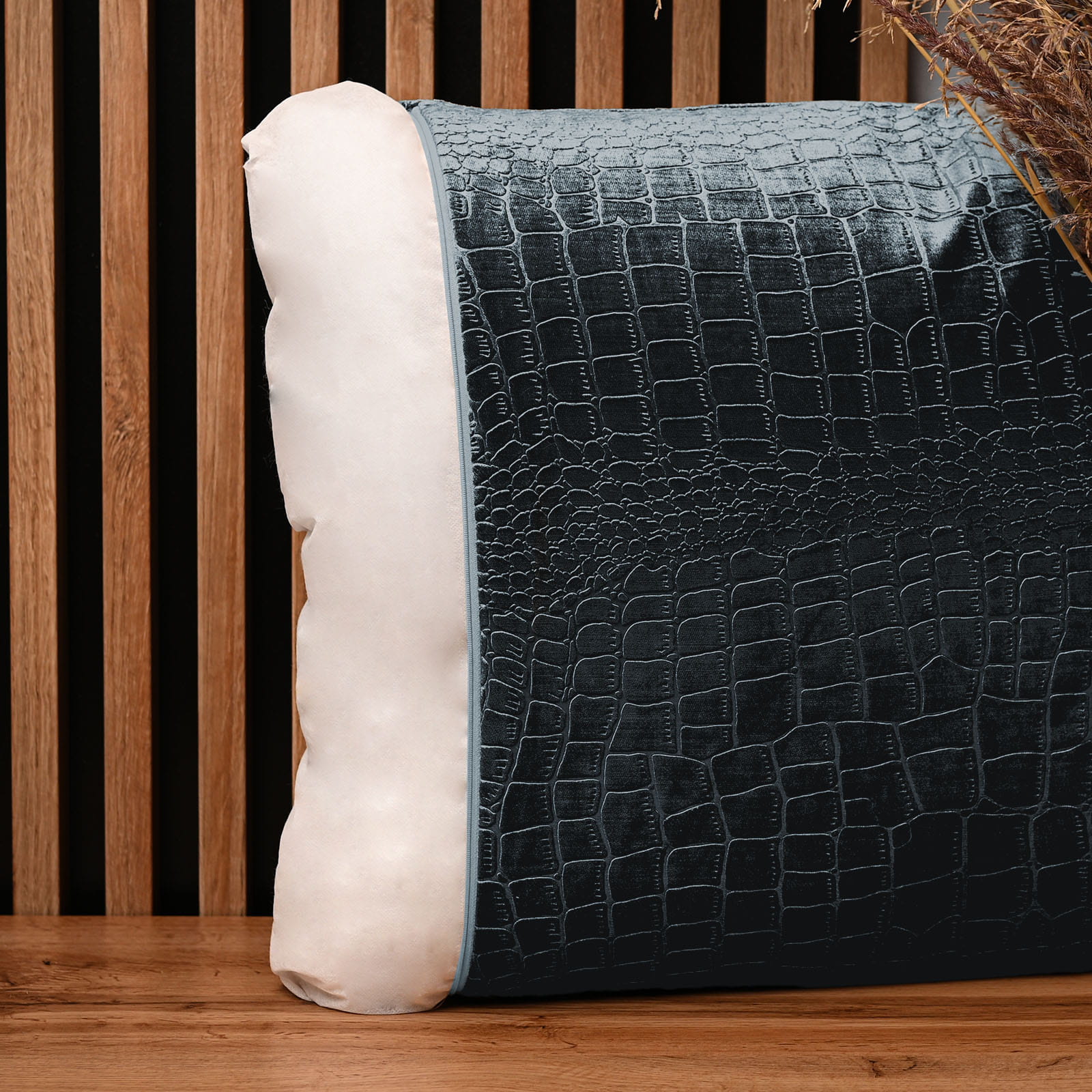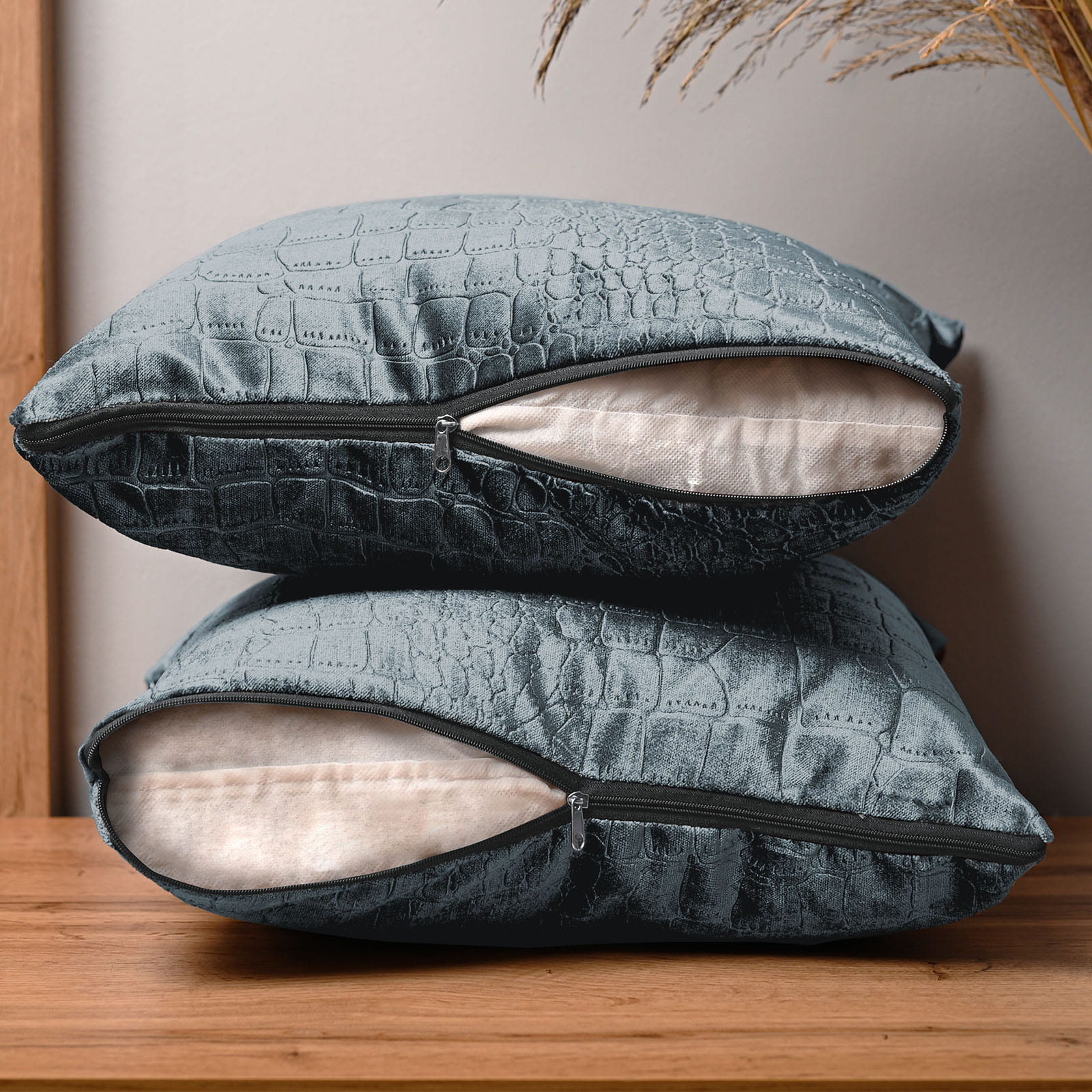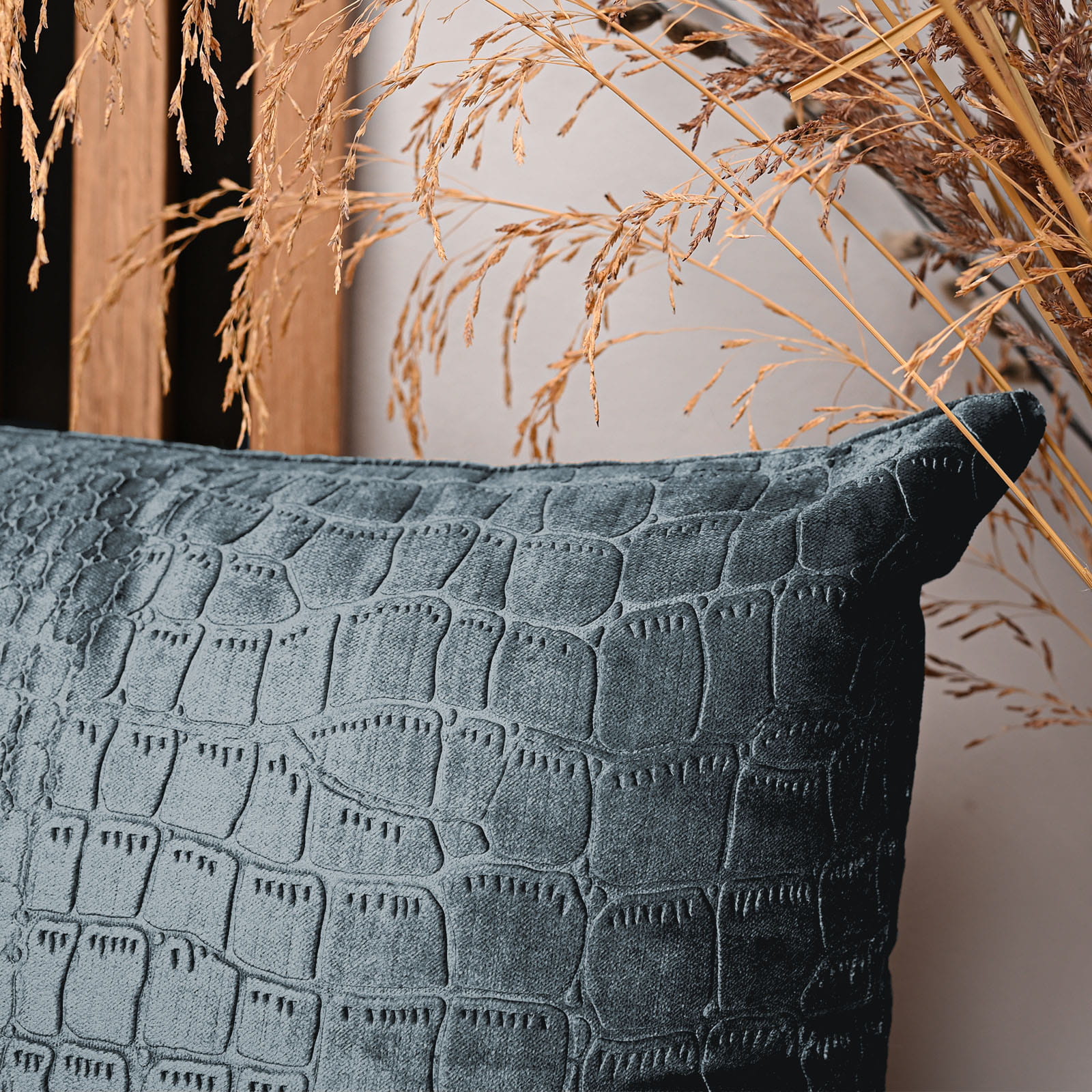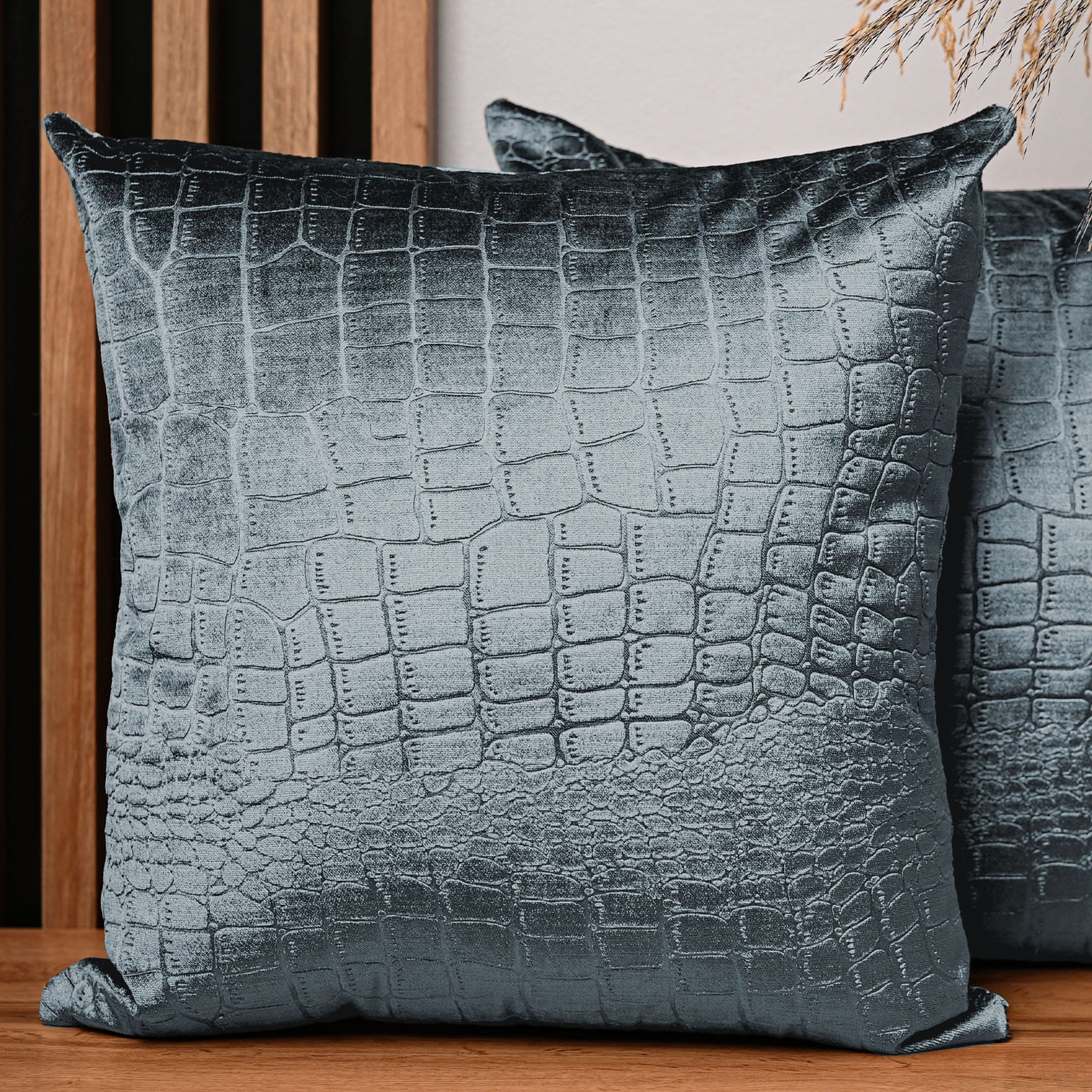 Dekorační povlak na polštář 60x60 cm z šedomodré velurové tkaniny s reliéfním vzorem "krokodýlí kůže"