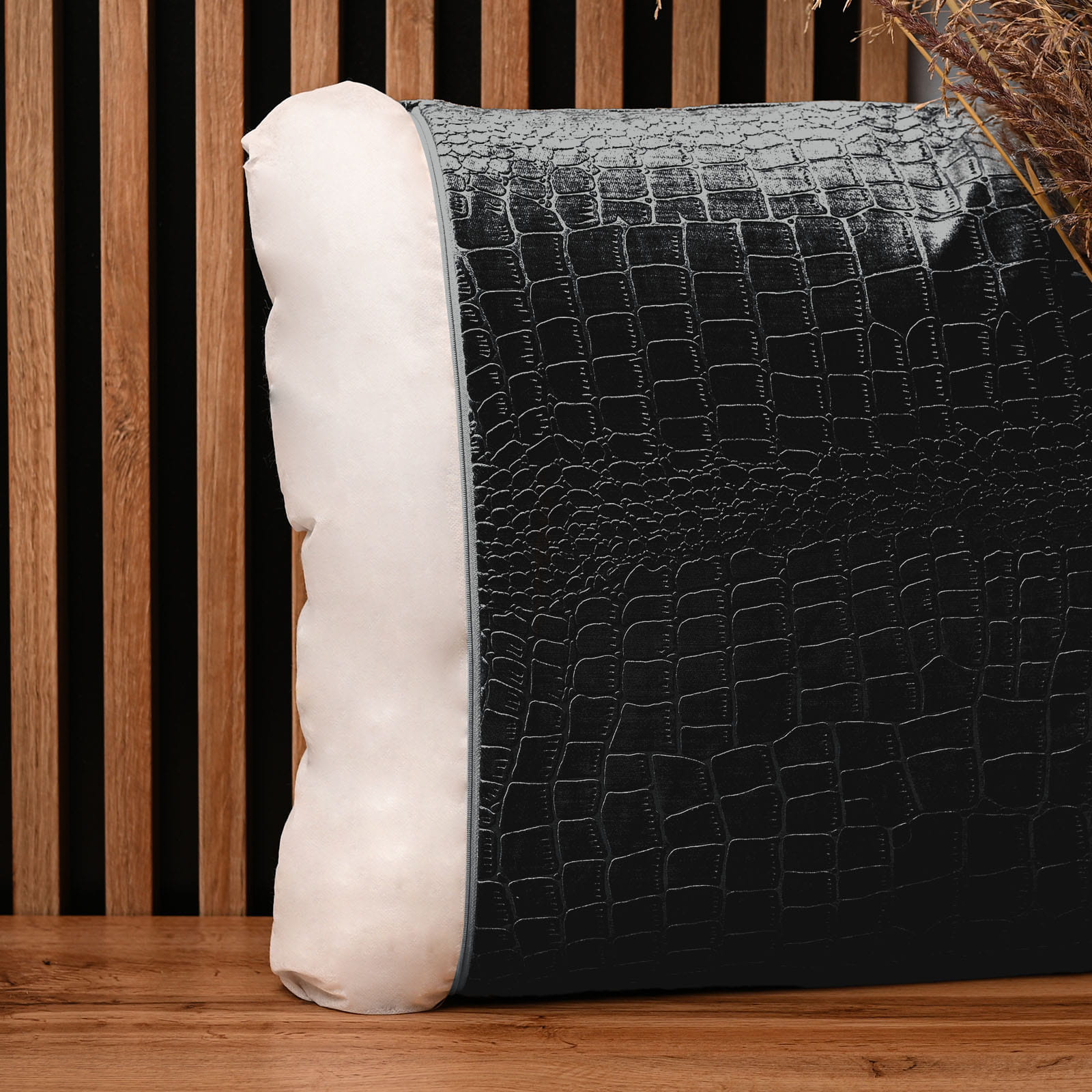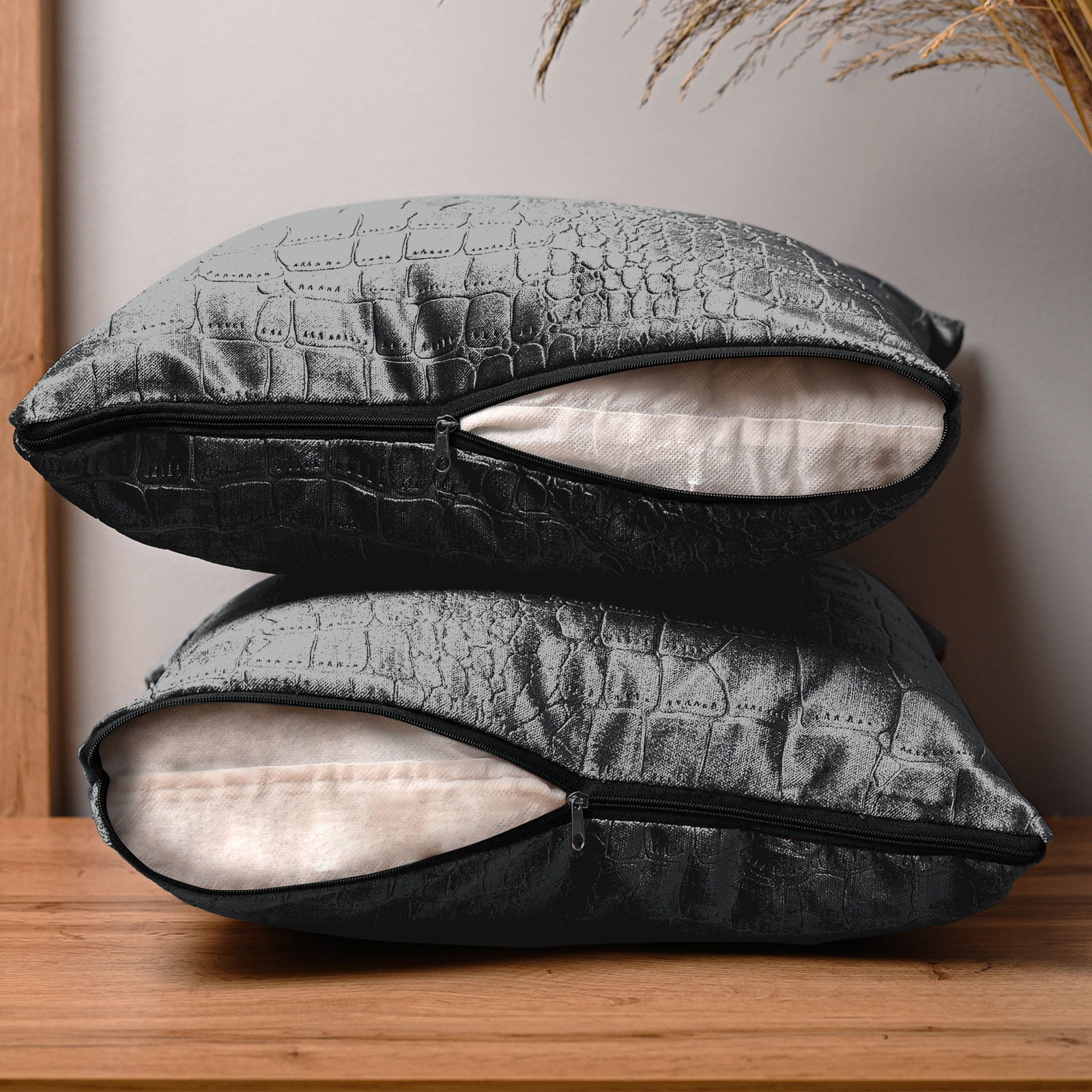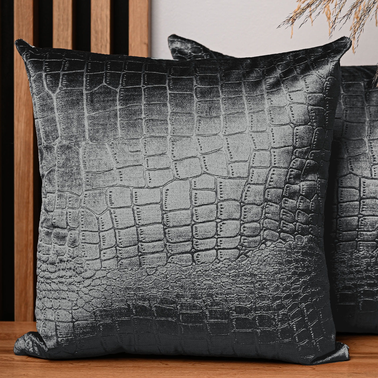Dekorační povlak na polštář 60x60 cm z tmavě šedé velurové tkaniny s reliéfním vzorem "krokodýlí kůže"