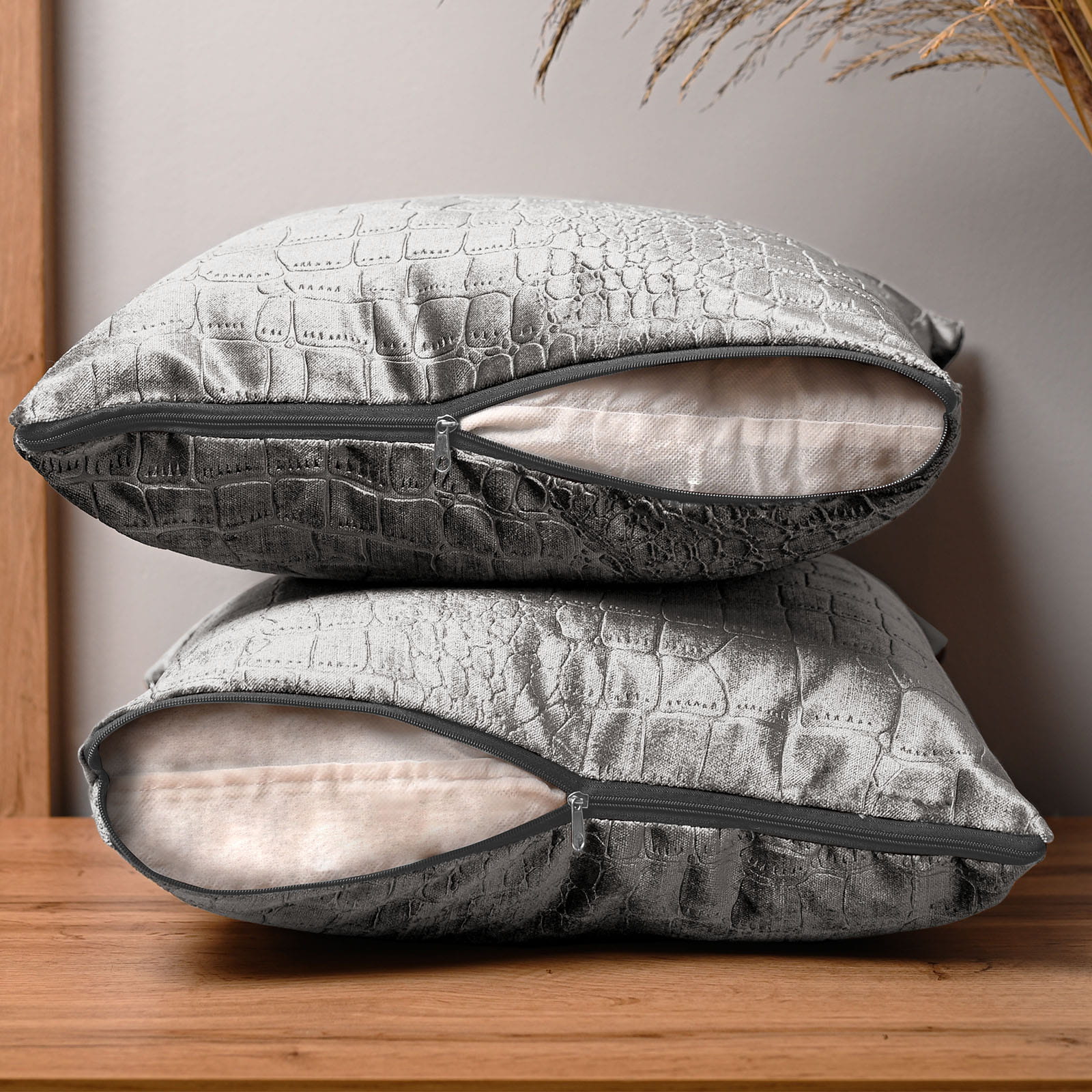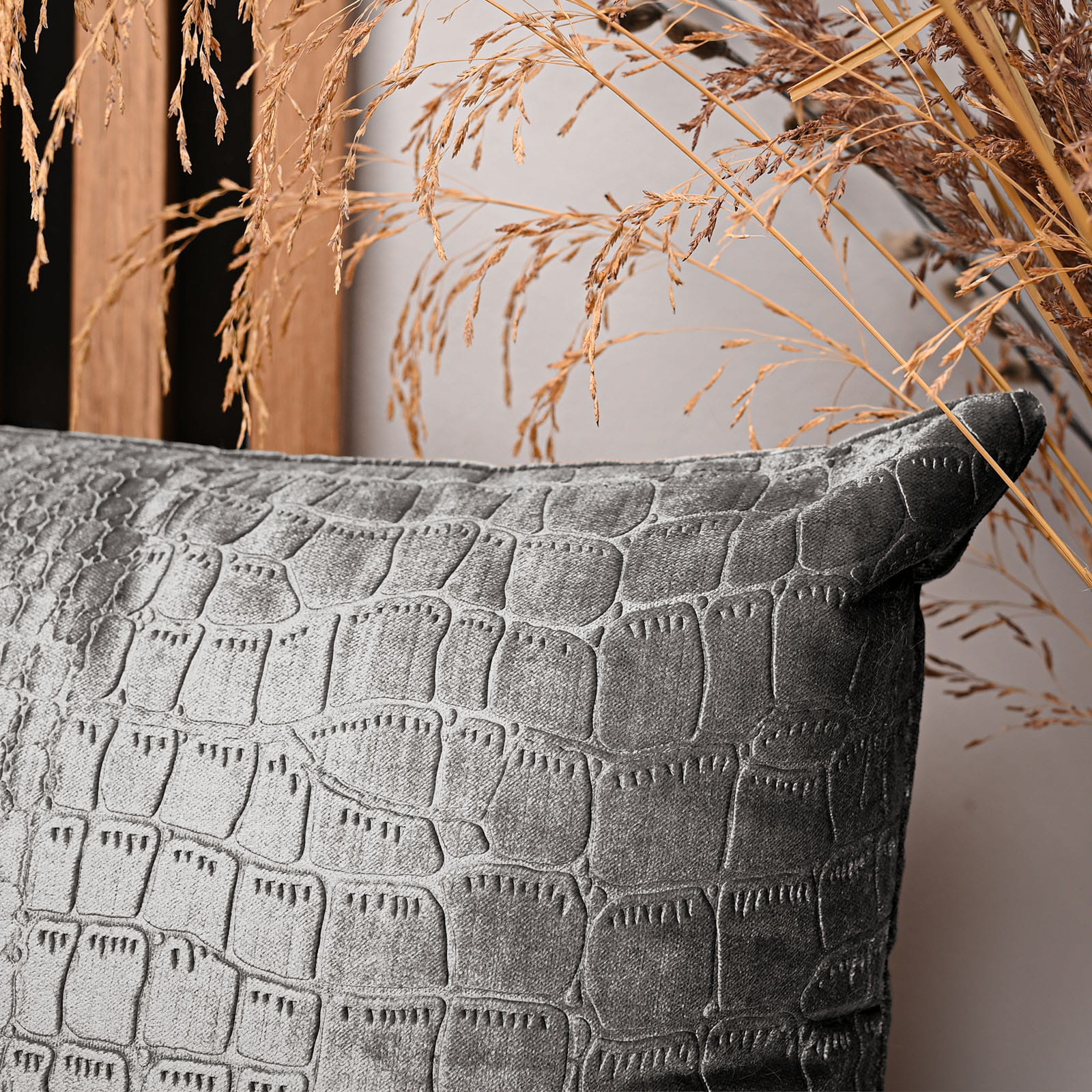 Dekorační povlak na polštář 60x60 cm ze světle šedé velurové tkaniny s reliéfním vzorem "krokodýlí kůže"