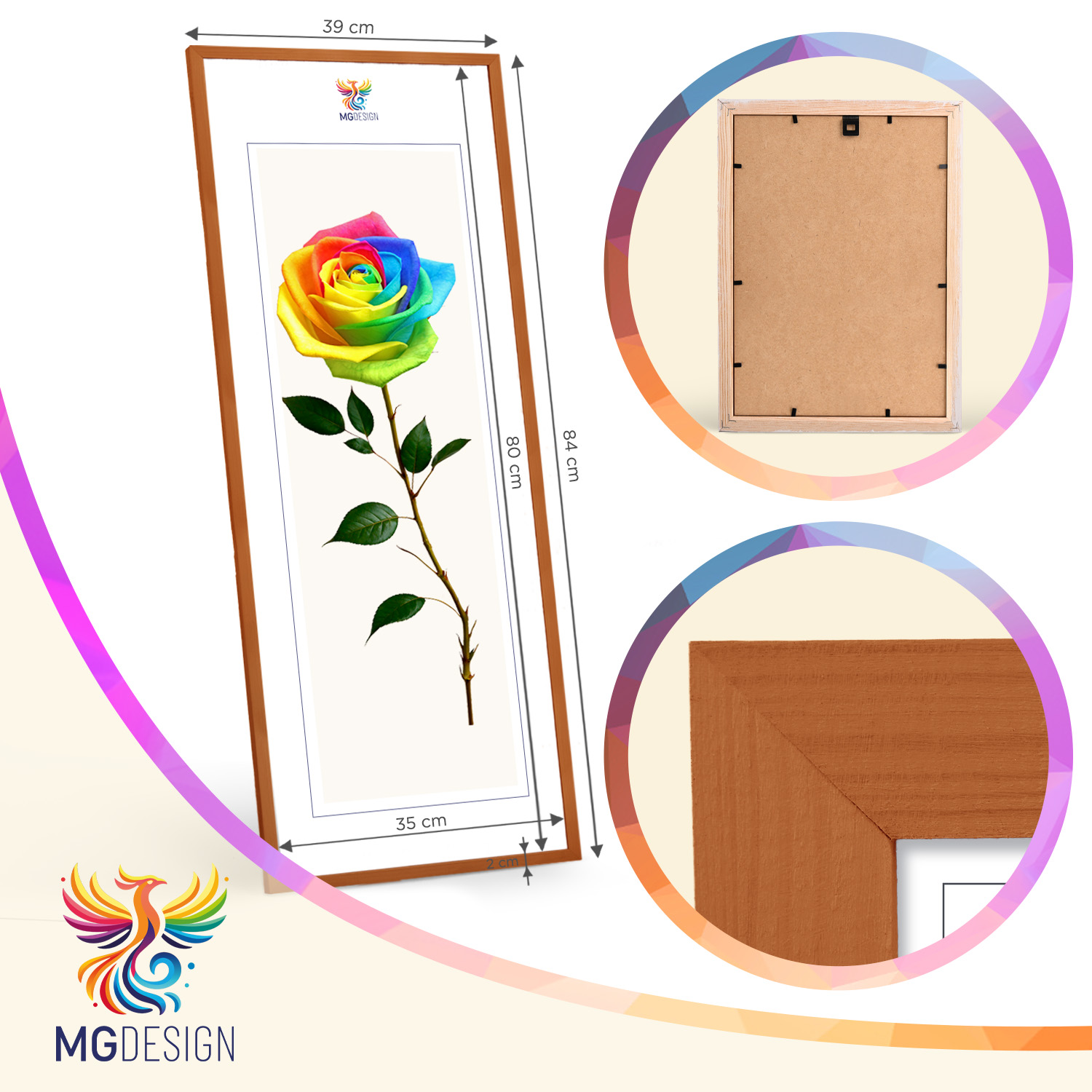 Rám je vyroben z přírodního dřeva, pečlivě opracovaného tak, aby byla zachována viditelná struktura materiálu, která dodává celku přirozený a nadčasový charakter. Přední část rámu tvoří lehké a odolné plexisklo, které je bezpečnější alternativou k tradičnímu sklu a zajišťuje dobrou viditelnost rámovaného díla.