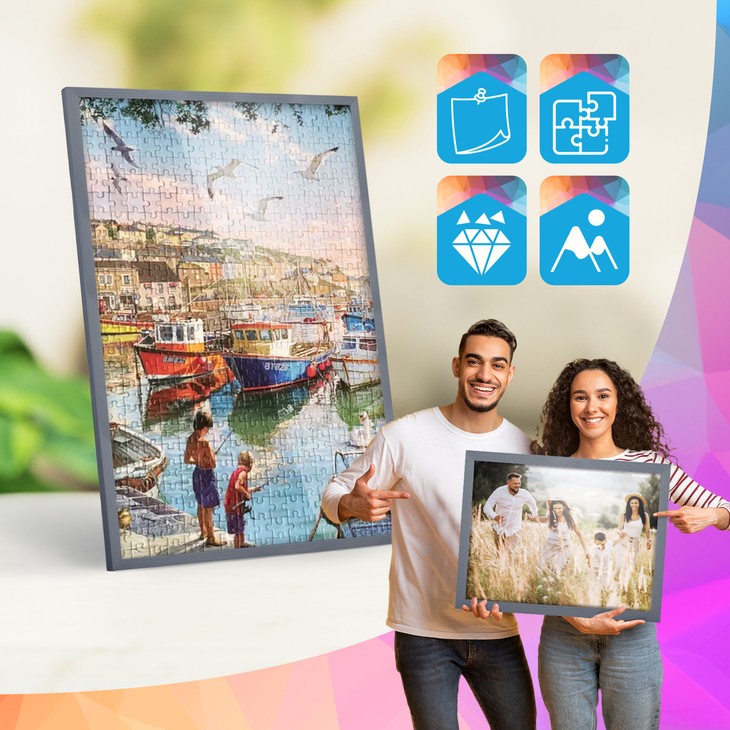 Rám lze vystavit jak na nábytku, tak na zdi. Integrovaná podpora a namontovaný závěs umožňují postavit nebo zavěsit rám svisle nebo vodorovně, takže jej lze snadno přizpůsobit interiéru.