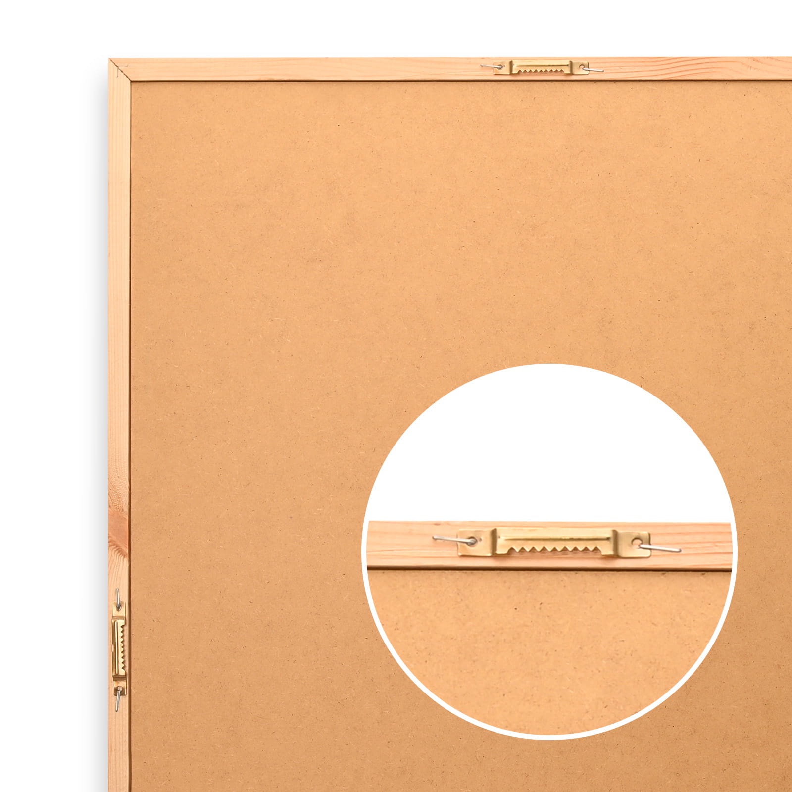 - Kovové závěsy - dva závěsy trvale připevněné k zadní straně rámu umožňují zavěšení korkové tabule na zeď ve svislé i vodorovné poloze.
