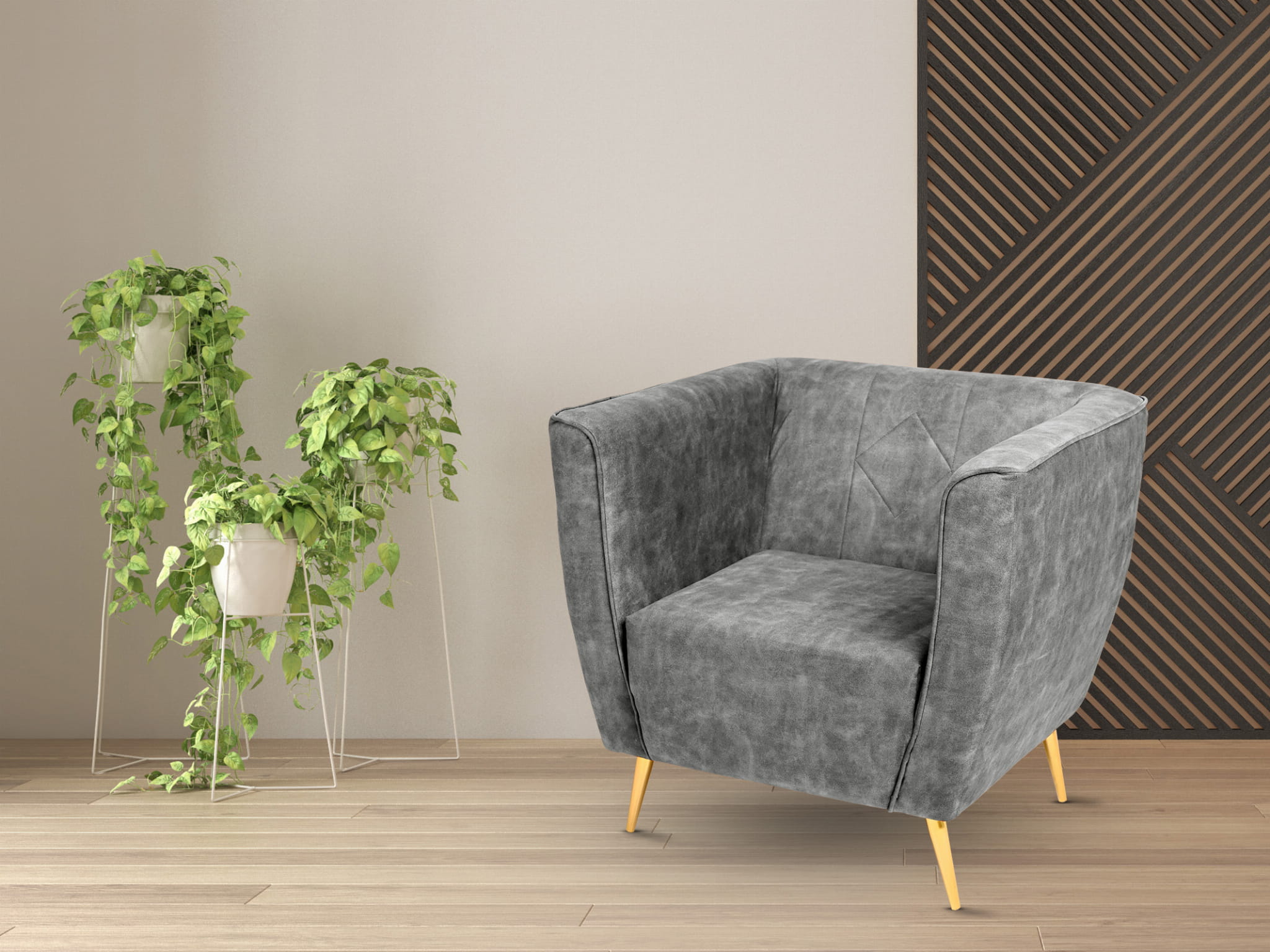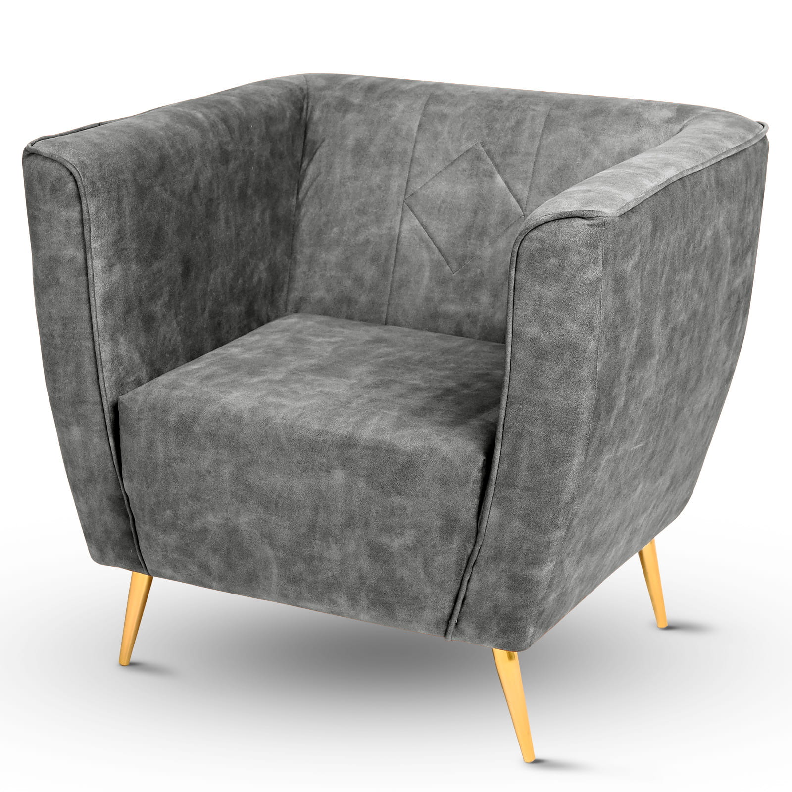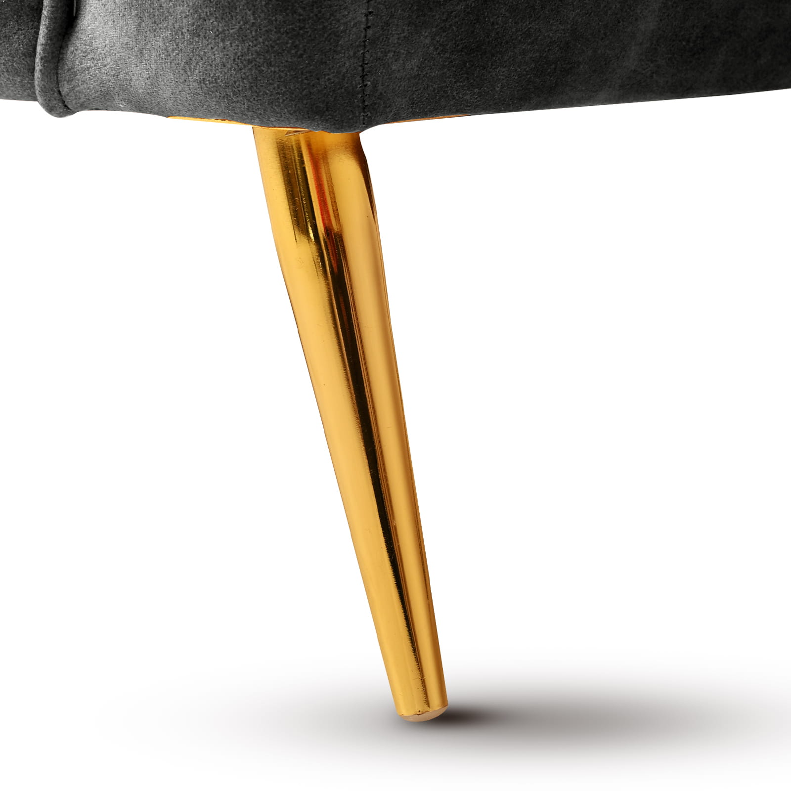 Křeslo Lara v šedé velurové látce s prošíváním a zlatými nohami
