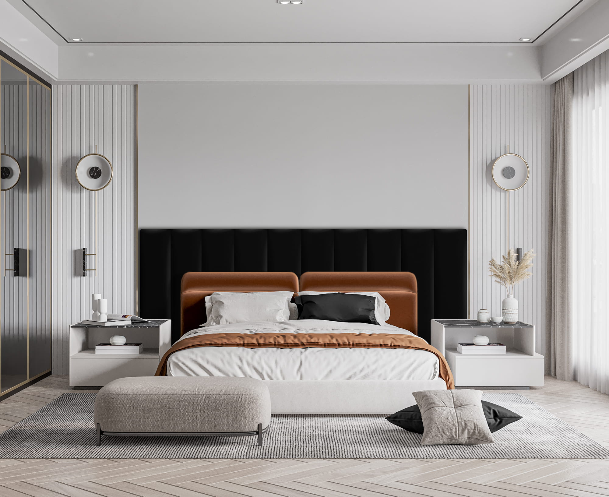 - Může být samostatným designovým prvkem stěny v ložnici nebo obývacím pokoji, který vnese do interiéru nádech elegance a útulnosti.
