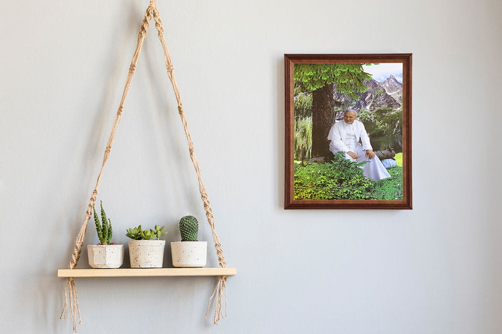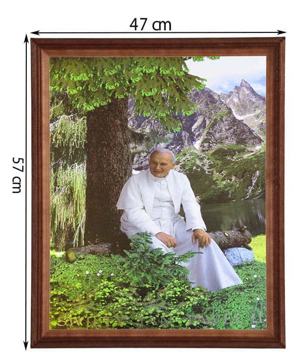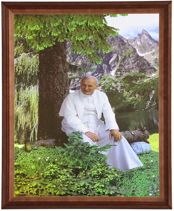Reprodukce v dřevěném rámu o velikosti 40x50 cm s náboženskou tematikou - Jan Pavel II. v horách