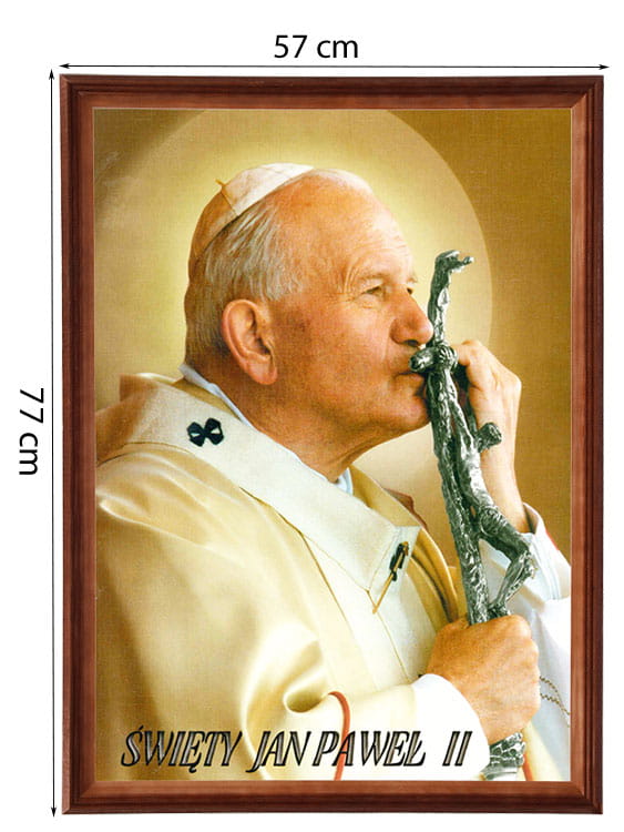 Reprodukce v dřevěném rámu o velikosti 50x70 cm s náboženskou tematikou – Jan Pavel II. s křížem