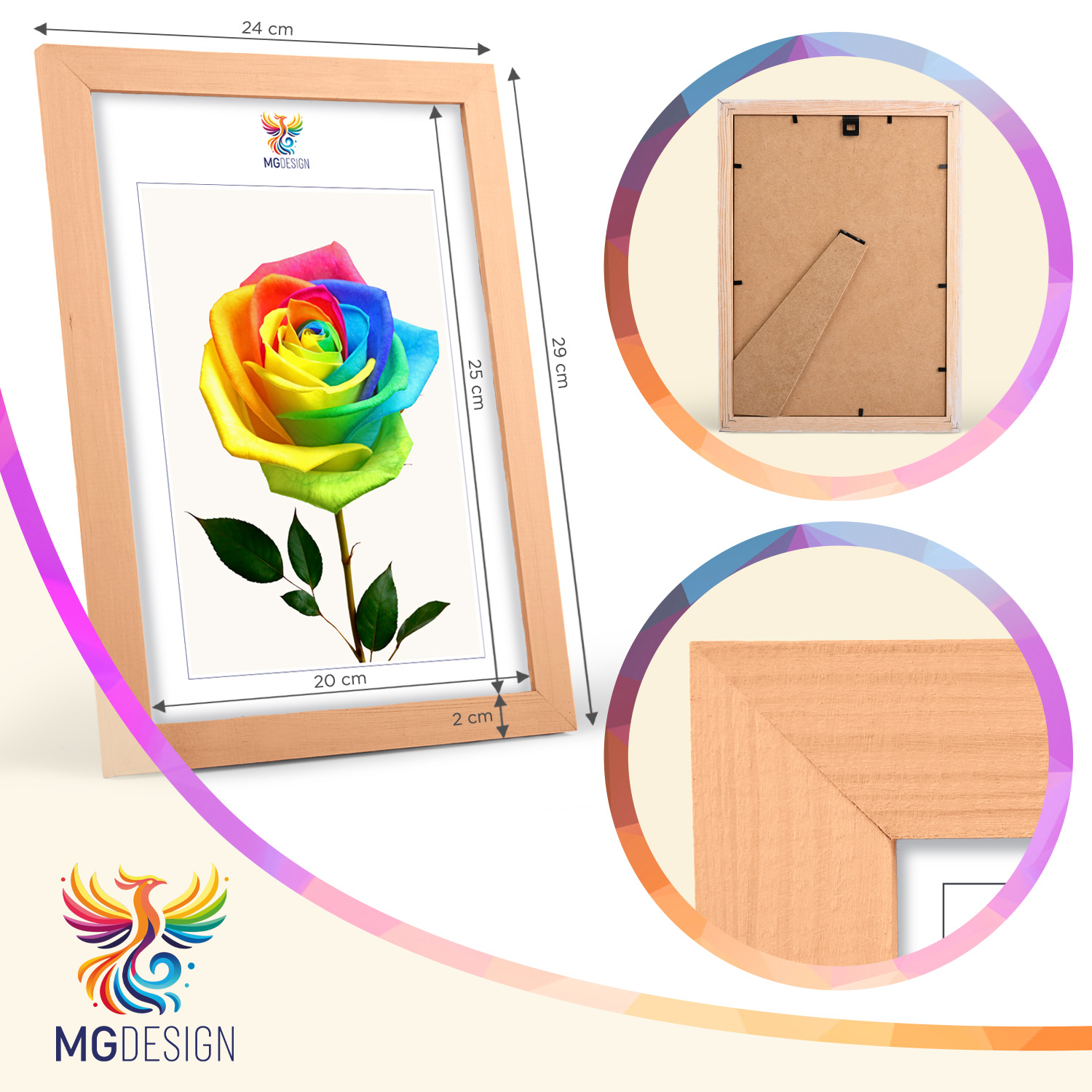 Rámečky jsou vyrobeny z přírodního dřeva, pečlivě opracovaného tak, aby byla zachována viditelná struktura materiálu, která dodává celku přirozený a nadčasový charakter. Přední část rámečků tvoří lehké a odolné plexisklo, které je bezpečnější alternativou k tradičnímu sklu a zajišťuje dobrou viditelnost zarámovaných děl.