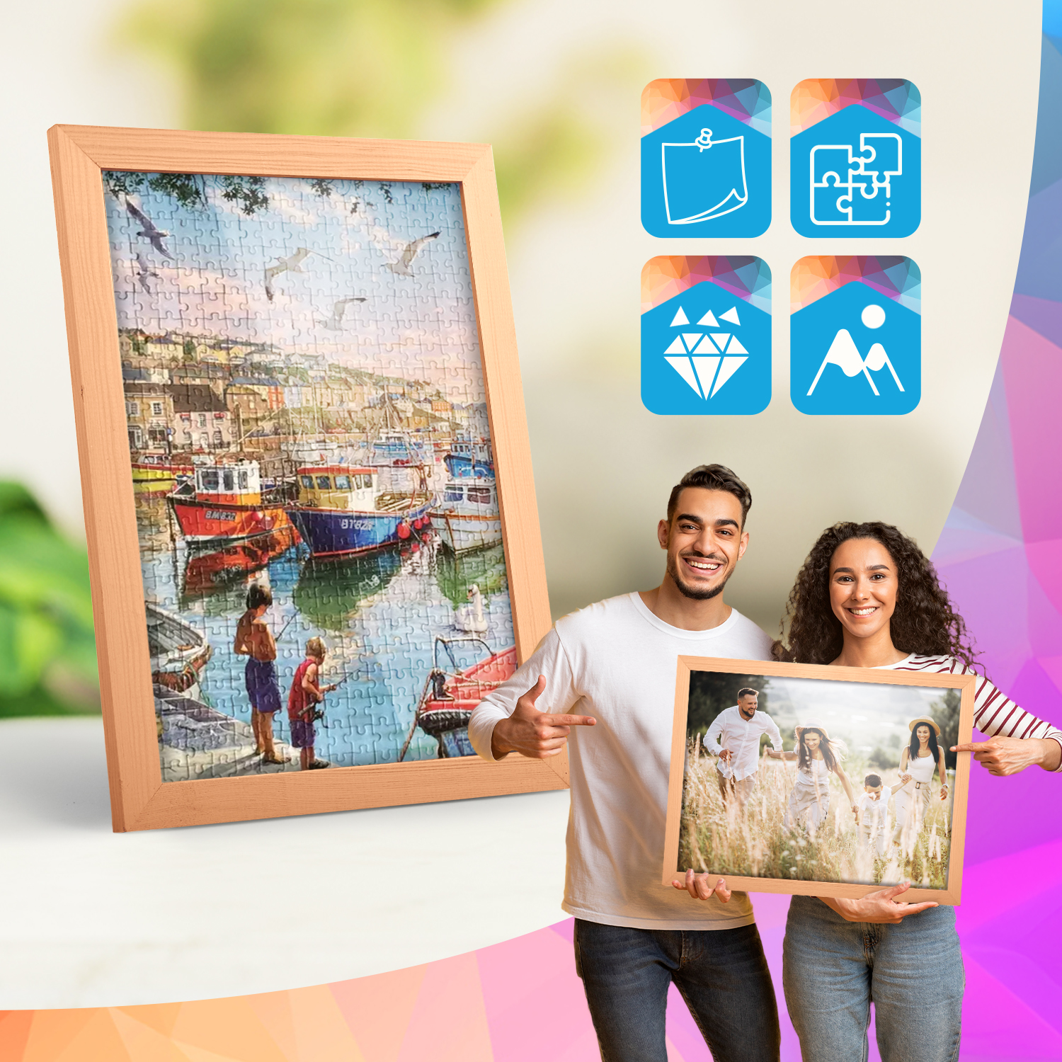 Rámečky jsou vyrobeny z přírodního dřeva, pečlivě opracovaného tak, aby byla zachována viditelná struktura materiálu, která dodává celku přirozený a nadčasový charakter. Přední část rámečků tvoří lehké a odolné plexisklo, které je bezpečnější alternativou k tradičnímu sklu a zajišťuje dobrou viditelnost rámovaných děl.