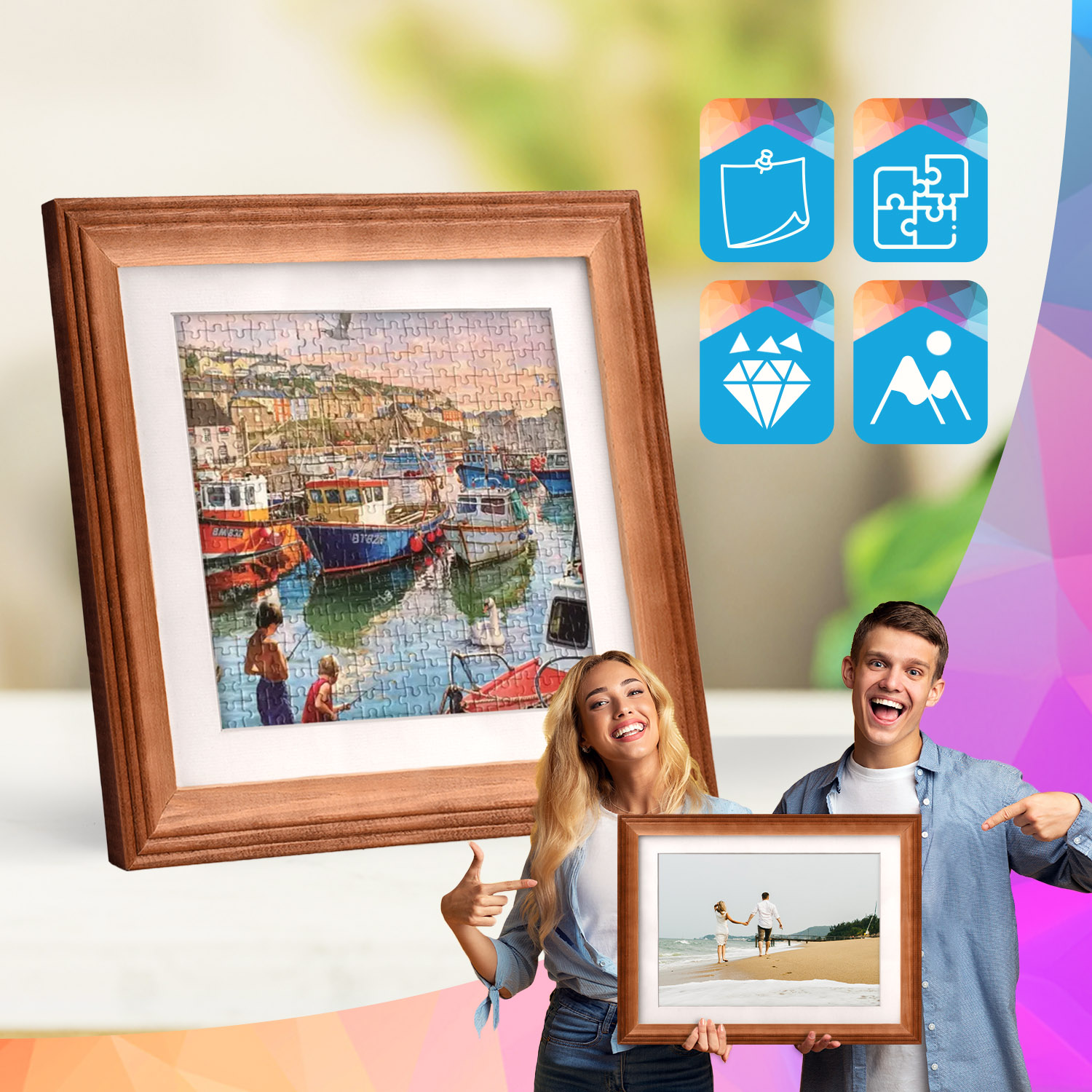 Sada frézovaných dřevěných rámečků je estetickým a jednotným řešením pro rámování fotografií, plakátů, grafik a uměleckých tisků. Dekorativní, precizně zpracovaný profil rámečků dodává celé kompozici elegantní charakter a zdůrazňuje prezentované motivy, přičemž zachovává uspořádaný a harmonický vzhled aranžmá.