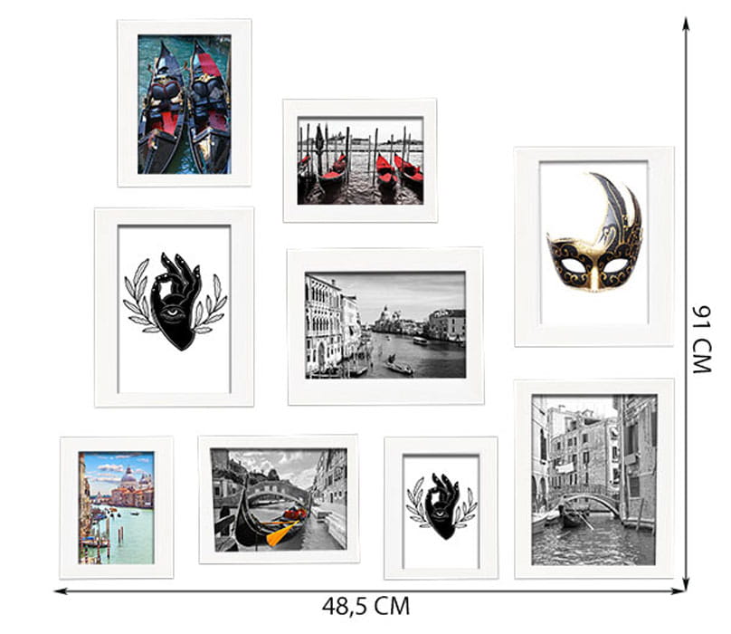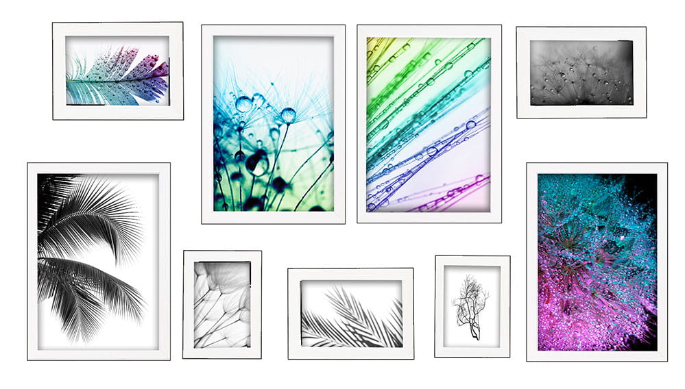 - Sada je navíc dodávána se šablonou, která umožňuje rychlé a snadné rozmístění rámů na stěně.