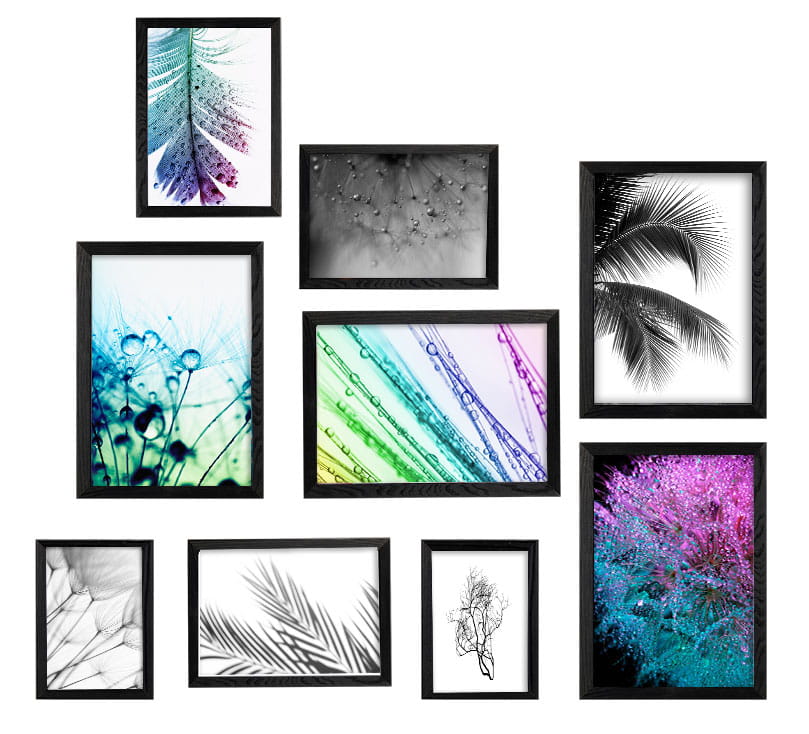 Sada 9 dřevěných rámů v černé barvě.