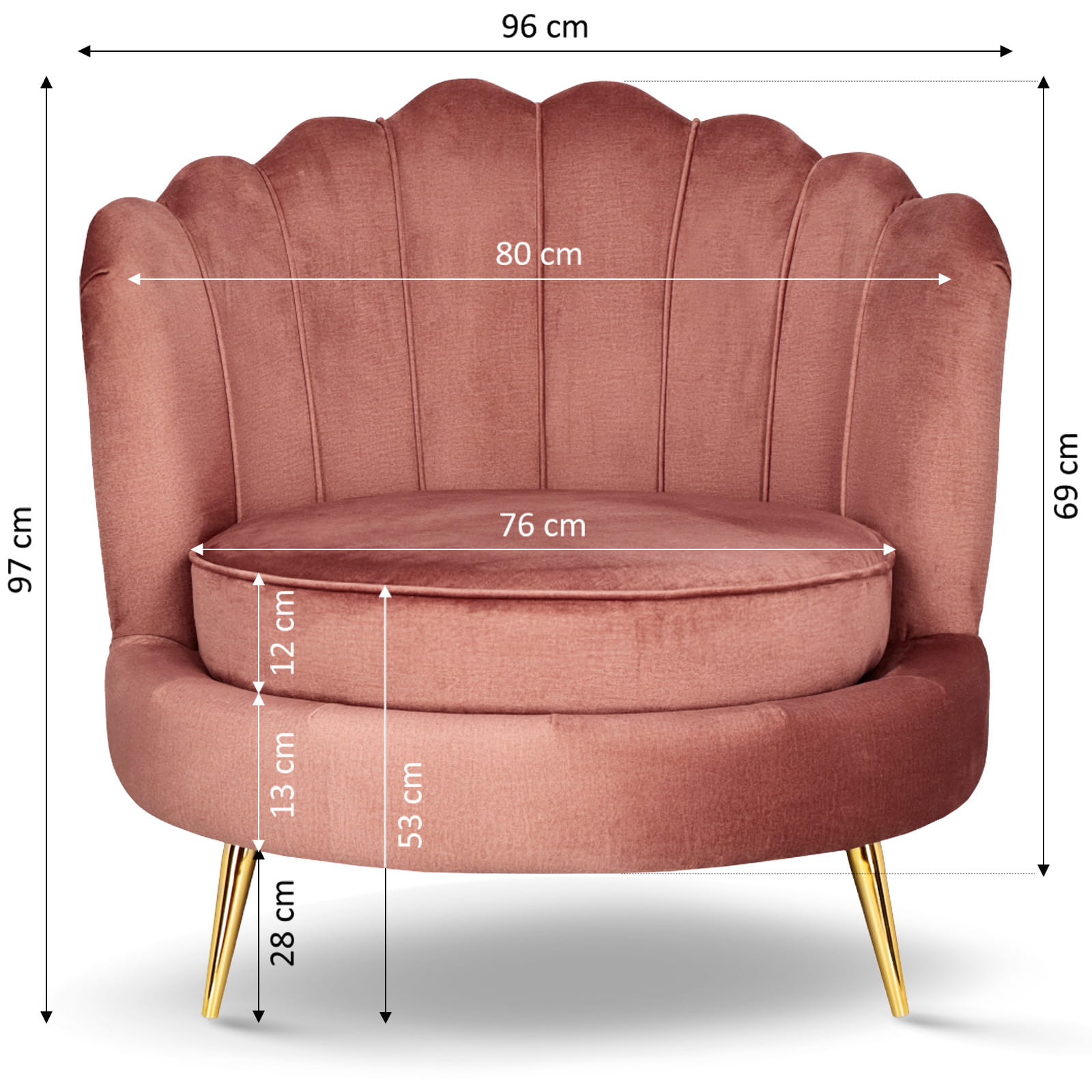Skořepinové křeslo LIVIA v růžové barvě se zlatými nohami a prošívaným opěradlem
